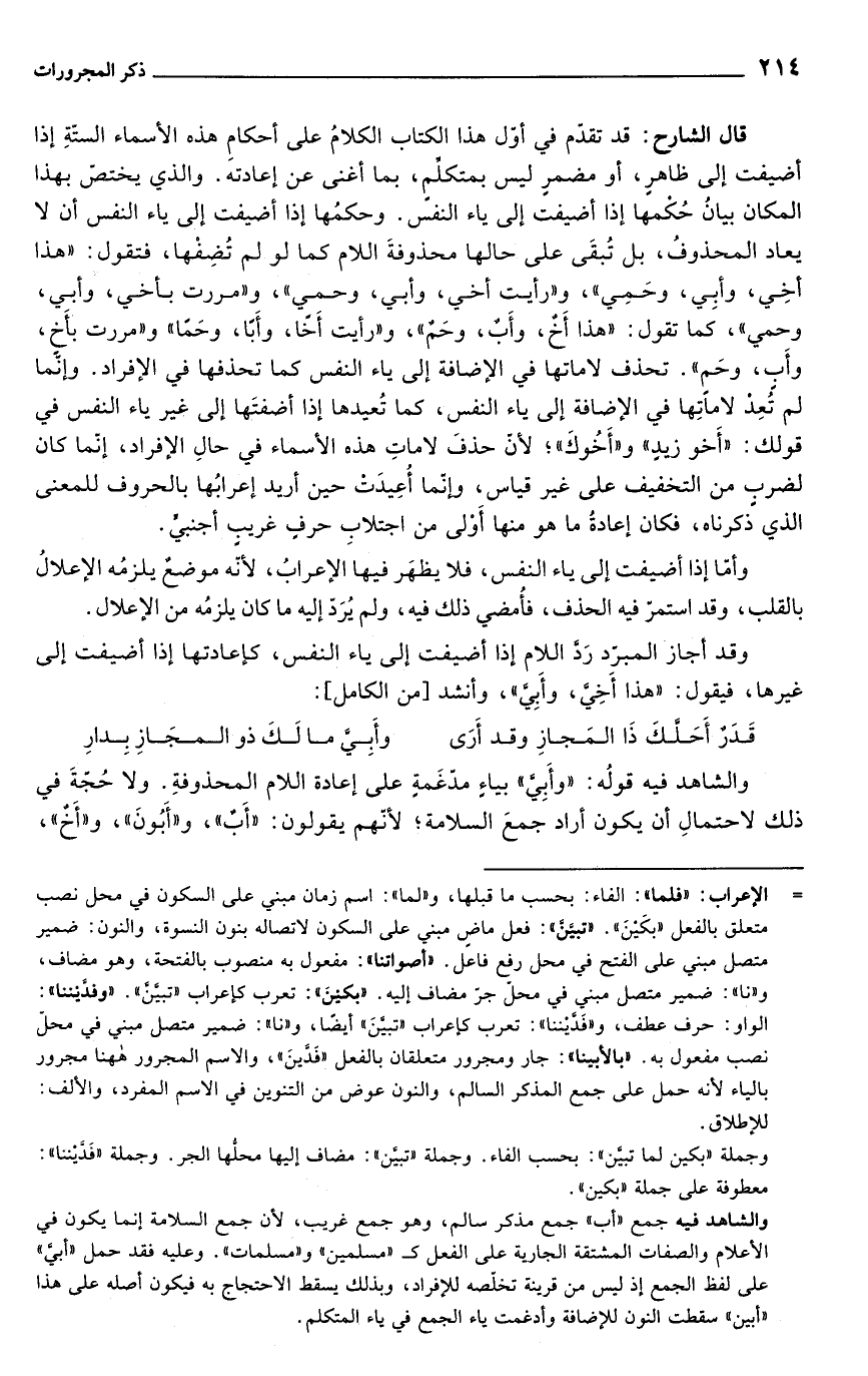 قال الشارح: قد تقدّم في أوّل هذا الكتاب الكلامُ على أحكامِ هذه الأسماء الستّةِ إذا أضيفت إلى ظاهرِ، أو مضمرِ ليس بمتكلّم، بما أغنى عن إعادته. والذي يختصّ بهذا المكان بيانُ حُكمها إذا أضيفت إلى ياء النفس. وحكمُها إذا أضيفت إلى ياء النفس أن لا يعاد المحذوفُ، بل تُبقَى على حالها محذوفةَ اللام كما لو لم تُضِفْها، فتقول: "هذا أخِي، وأبِي، وحَمِي"، و"رأيت أخي، وأبي، وحمي"، و"مررت بأخي، وأبي، وحِمي"، كما تقول: "هذا أَخٌ، وأَبٌ، وحَمٌ"، و"رأيت أَخًا، وأَبًا، وحَمًا" و"مررت بأخ، وأبِ، وحَم". تحذف لاماتها في الإضافة إلى ياء النفس كما تحذفها في الإفراد. وإنما لم تُعِدْ لاماتِها في الإضافة إلى ياء النفس، كما تُعيدها إذا أضفتَها إلى غير ياء النفس في قولك: "أَخو زيدٍ" و"أَخُوكَ"؛ لأن حذفَ لاماتِ هذه الأسماء في حالِ الإفراد، إنّما كان لضرب من التخفيف على غير قياس، وإنّما أُعِيدَتْ حين أريد إعرابُها بالحروف للمعنى الذي ذكرناه، فكان إعادةُ ما هو منها أَوْلى من اجتلابِ حرفٍ غريبٍ أجنبىّ.