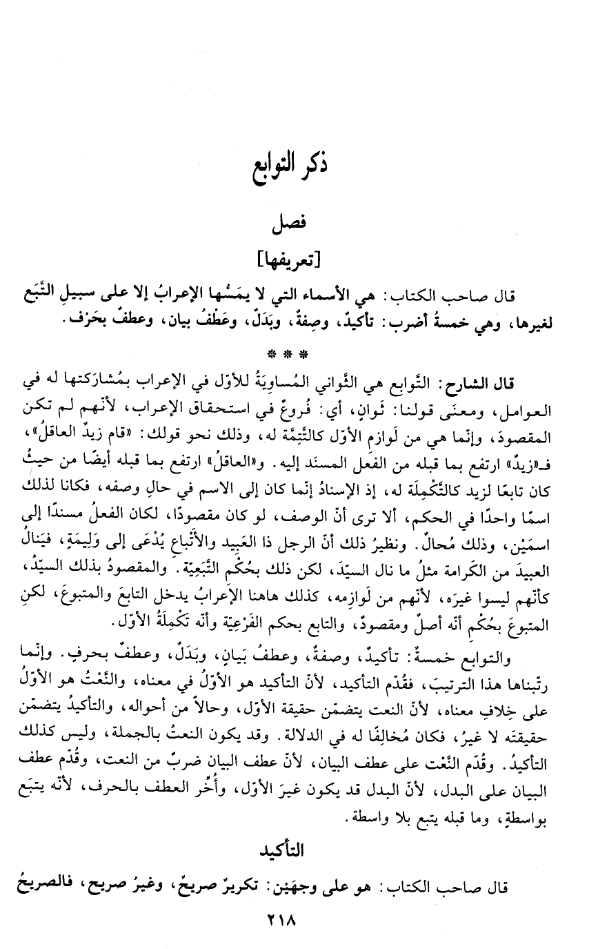 قال الشارح: التَّوابع هي الثواني المُساوِيَةُ للأوّل في الإعراب بمُشارَكتها له في العوامل، ومعنَى قولنا: ثَوانٍ، أي: فُروعٌ في استحقاق الإعراب، لأنّهم لم تكن المقصودَ، وإنَّما هي من لَوازمِ الأول كالتَّتِمَّة له، وذلك نحو قولك: "قام زيدٌ العاقلُ"، فـ "زيدٌ" ارتفع بما قبله من الفعل المسنَد إليه. و"العاقلُ" ارتفع بما قبله أيضًا من حيثُ كان تابعًا لزيد كالتَّكْمِلَة له، إذ الإسنادُ إنّما كان إلى الاسم في حالِ وصفه، فكانا لذلك اسمًا واحدًا في الحكم، ألا ترى أنّ الوصف، لو كان مقصودًا، لكان الفعلُ مسندًا إلى اسمَين، وذلك مُحالٌ. ونظيرُ ذلك أن الرجل ذا العَبِيد والأَتْباعِ يُدْعَى إلى وَلِيمَةٍ، فيَنالُ العبيدَ من الكَرامة مثلُ ما نال السيدَ، لكن ذلك بحُكمِ التَّبَعِية. والمقصودُ بذلك السيّد، كأنّهم ليسوا غيرَه، لأنّهم من لَوازِمه، كذلك ها هنا الإعرابُ يدخل التابعَ والمتبوعَ، لكنِ المتبوعَ بحُكْمِ أنه أصلٌ ومقصودٌ، والتابع بحكم الفَرْعِيّة وأنّه تَكْمِلَةُ الأول.