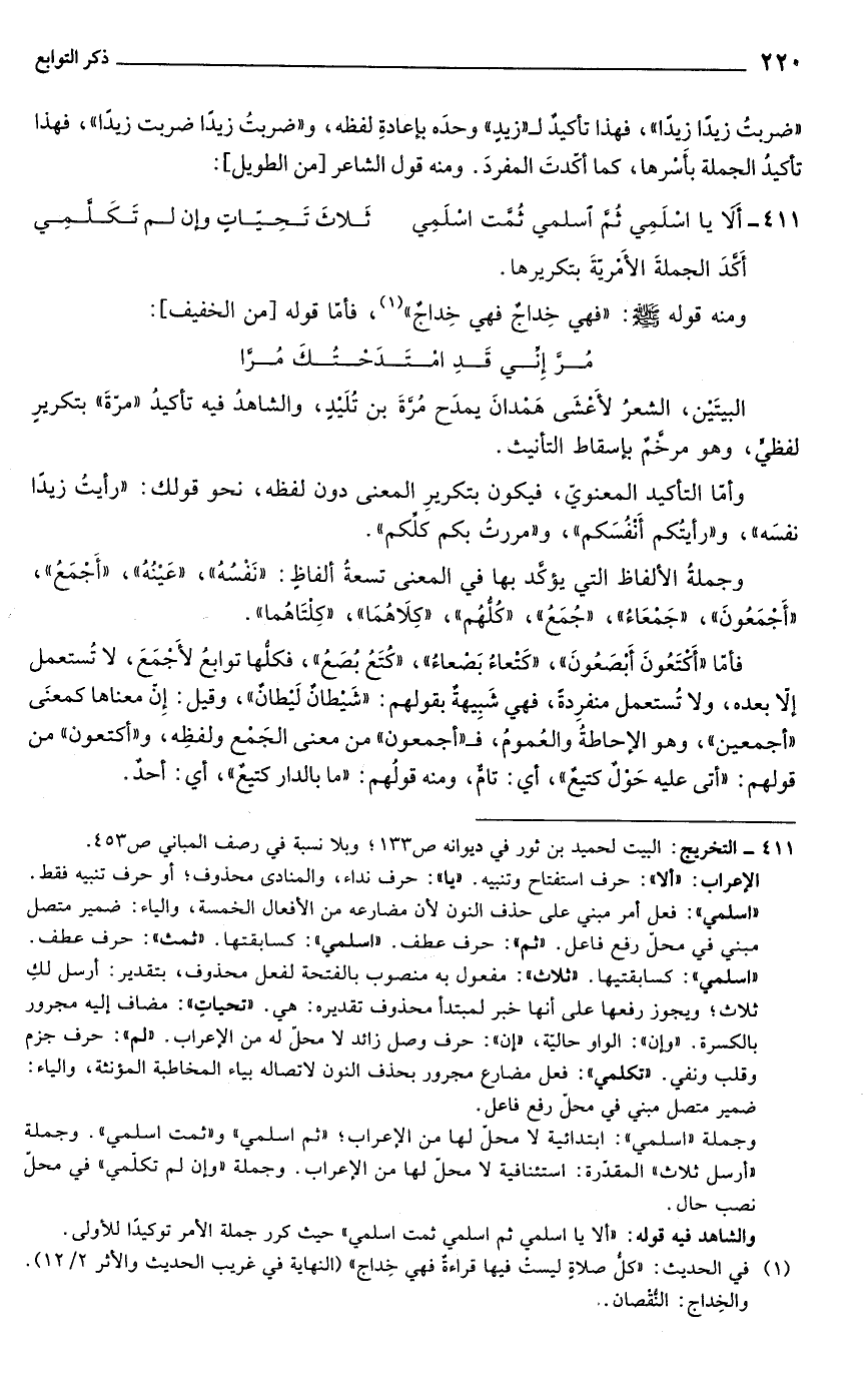 والشاهد فيه قوله: "ألا يا اسلمي ثم اسلمي ثمت اسلمي" حيث كرر جملة الأمر توكيدًا للأولى.