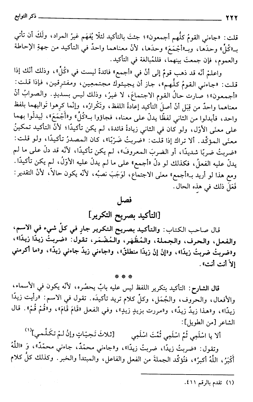 قال الشارح: التأكيد بتكرير اللفظ ليس عليه بابٌ يحصُره, لأنّه يكون في الأسماء، والأفعال، والحروف، والجُمَل، وكلّ كلام تريد تأكيدَه. تقول في الاسم: "رأيت زيدًا زيدًا"، و"هذا زيدٌ زيدٌ"، و"مررت بزيدٍ زيدٍ"، وفي الفعل "قَامَ قَامَ"، و"قُمْ قُمْ". قال الشاعر [من الطويل]: