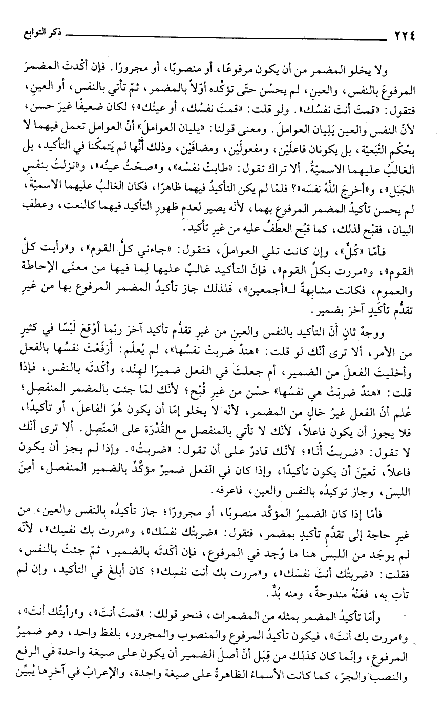 ولا يخلو المضمر من أن يكون مرفوعًا، أو منصوبًا، أو مجرورًا. فإن أكّدتَ المضمرَ المرفوعَ بالنفس، والعينِ، لم يحسُن حتى تؤكّده أوّلًا بالمضمر، ثمّ تأتي بالنفس، أو العينِ، فتقول: "قمتَ أنتَ نفسُك". ولو قلت: "قمتَ نفسُك، أو عينُك"؛ لكان ضعيفًا غيرَ حسن، لأنّ النفس والعين يَلِيان العواملَ. ومعنى قولنا: "يليان العواملَ" أن العوامل تعمل فيهما لا بحُكْم التَّبَعيّة، بل يكونان فاعلَيْن، ومفعولَيْن، ومضافَيْن، وذلك أَنَّها لم يَتمكّنا في التأكيد، بل الغالبُ عليهما الاسميّةُ. ألا تراك تقول: "طابتْ نفسُه"، و"صحّتُ عينُه"، و"نزلتُ بنفسِ الجَبَل"، و"أخرجَ الله نفسَه"؟ فلمّا لم يكن التأكيدُ فيهما ظاهرًا، فكان الغالبُ عليهما الاسميّةَ، لم يحسن تأكيدُ المضمر المرفوعِ بهما, لأنّه يصير لعدمِ ظهورِ التأكيد فيهما كالنعت، وعطفِ البيان، فقبُح لذلك، كما قبُح العطفُ عليه من غيرِ تأكيد.