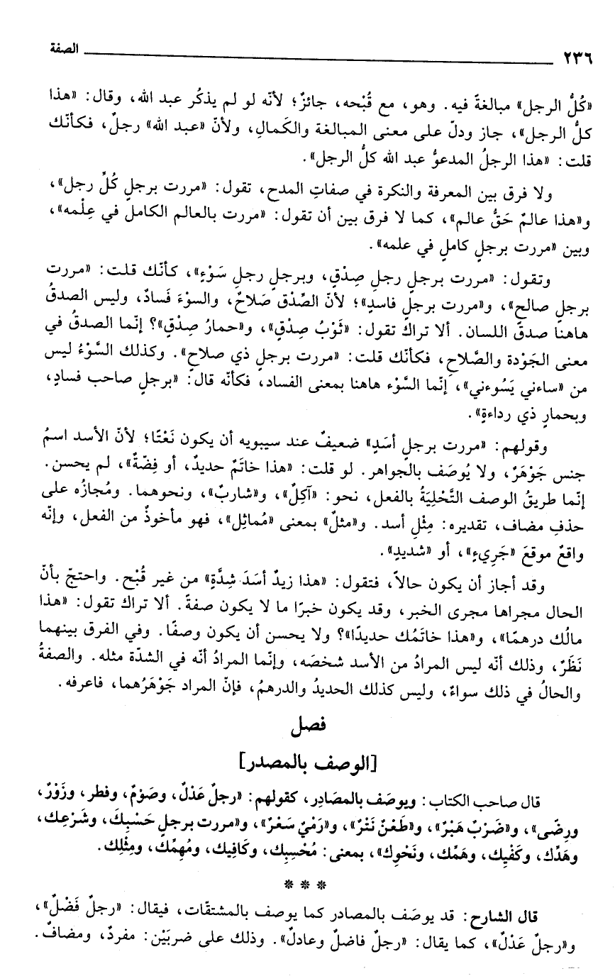 قال الشارح: قد يوصَف بالمصادر كما يوصف بالمشتقات، فيقال: "رجلٌ فَضْلٌ"؟، و"رجلٌ عَدْلٌ"، كما يقال: "رجلٌ فاضلٌ وعادلٌ". وذلك على ضربَيْن: مفردٌ، ومضافٌ.