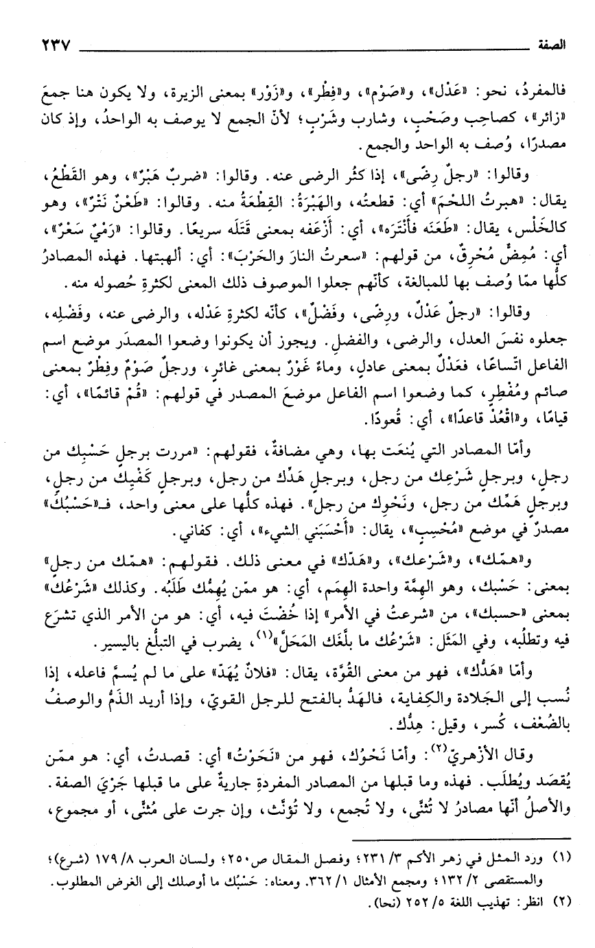 وقالوا: "رجلٌ عَدْلٌ، ورِضى، وفَضْلٌ"، كأنّه لكثرةِ عَدْله، والر ضى عنه، وفَضْلِه، جعلوه نفسَ العدل، والرضى، والفضلِ. ويجوز أن يكونوا وضعوا المصدَر موضع اسم الفاعل اتّساعًا، فعَدْلٌ بمعنى عادلٍ، وماءٌ غَوْرٌ بمعنى غائرٍ، ورجلٌ صَوْمٌ وفِطْرٌ بمعنى صائم ومُفطِرٍ، كما وضعوا اسم الفاعل موضعَ المصدر في قولهم: "قُمْ قائمًا"، أي: قيامًا، و"اقْعُدْ قاعدًا"، أي: قُعودًا.