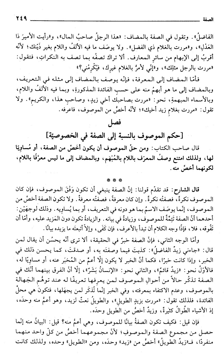 قال صاحب الكتاب: ومن حق الموصوف أن يكون أخص من الصفة أو مساوياً لها ولذلك امتنع وصف المعرف باللام بالمبهم وبالمضاف إلى ما ليس معرفاً باللام لكونا أخص منه.