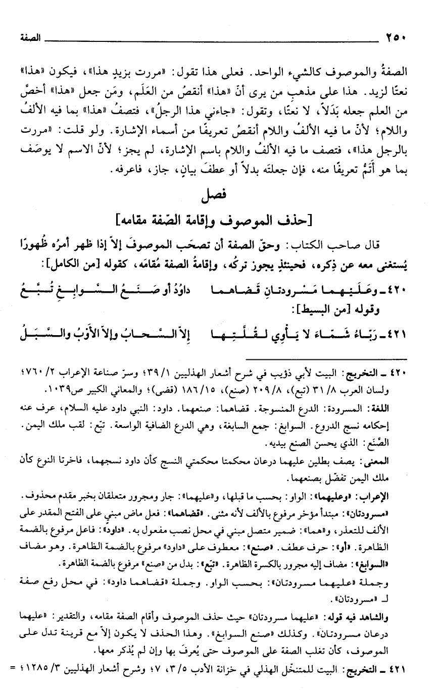 والشاهد فيه قوله: "عليهما مسرودتان" حيث حذف الموصوف وأقام الصفة مقامه، والتقدير: "عليهما درعان مسرودتان". وكذلك "صنع السوابغ". وهذا الحذف لا يكون إلَّا مع قرينة تدل على الموصوف، كأن تغلب الصفة على الموصوف حتى يُعرفَ بها وإن لم يُذْكر معها.