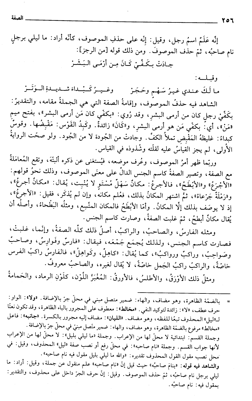 وربّما ظهر أمرُ الموصوف، وعُرف موضعه، فيُستغنى عن ذكره ألبتّهَ، وتقع المُعامَلةُ مع الصفة، وتصير الصفةُ كاسم الجنس الدالّ على معنَى الموصوف، وذلك نحوُ قولهم: "الأجْرَعُ"و"الأبْطَحُ"، فالأجرعُ: مكانٌ سَهْلٌ مُسْتَوٍ لا يُنْبِت، يُقال: "مكانٌ أجرعُ"، و"رَمْلَةٌ جَرْعاءُ"، ثمُّ اشتهر المكانُ بذلك، فعُلم مكانه، دمان لم يُذكَر، فقيل: "الأجرعُ"، إذ لا يوصَف بذلك إلَّا المكانُ. وأمّا الأبْطَحُ فالمكان المتَّسِع، ومثلُه البَطْحاءُ، وأصلُه أن يُقال مكانٌ أبطحُ، ثمّ غلبت الصفةُ، وصارت كاسم الجنس.