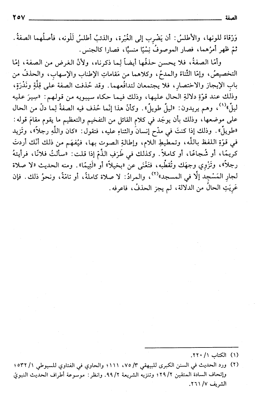 وأمّا الصفةُ، فلا يحسن حذفُها أيضًا لِما ذكرناه، ولأنّ الغرض من الصفة، إمّا التخصيصُ، وإمّا الثَّناءُ والمدحُ، وكلاهما من مَقاماتِ الإطناب والإسهابِ، والحذفُ من باب الإيجاز والاختصارِ، فلا يجتمعان لتدافُعهما. وقد حُذفت الصفة عَلى قِلَّةٍ ونَدْرَةٍ، وذلَك عند قوّةِ دلالةِ الحال عليها، وذلك فيما حكاه سيبويه من قولهم: "سِيرَ عليه ليلٌ" (¬1)، وهم يريدون: "ليلٌ طويلٌ". وكأنّ هذا إنّما حُذف فيه الصفةُ لِما دلّ من الحال على موضعها، وذلك بأن يوجَد في كلامِ القائل من التفخيم والتعظيم ما يقوم مقامَ قوله: "طويلٌ". وذلك إذا كنتَ في مدْح إنسان والثناءِ عليه، فتقول: "كان واللهِ رجلاً"، وتَزيد في قوّةِ اللفظ بالله، وتمطيطِ اللام، وإطالةِ الصوت بها، فيُفهَم من ذلك أنّك أردتَ كريمًا، أو شُجاعًا، أو كاملًا. وكذلك في طَرَفِ الذَّمّ إذا قلت: "سألتُ فلانًا، فرأيتهُ رجلًا"، وتَزْوِي وجهَك وتُقطَّبه، فتَغْنَى عن "بخيلًا" أو"لَئِيمًا". ومنه الحديث "لا صلاة لجارِ المَسْجِد إلَّا في المسجد" (¬2)، والمرادُ: لا صلاة كاملةً، أو تامّةً، ونحوُ ذلك. فإن عَرِيَتِ الحالُ من الدلالة، لم يجز الحذفُ، فاعرفه.