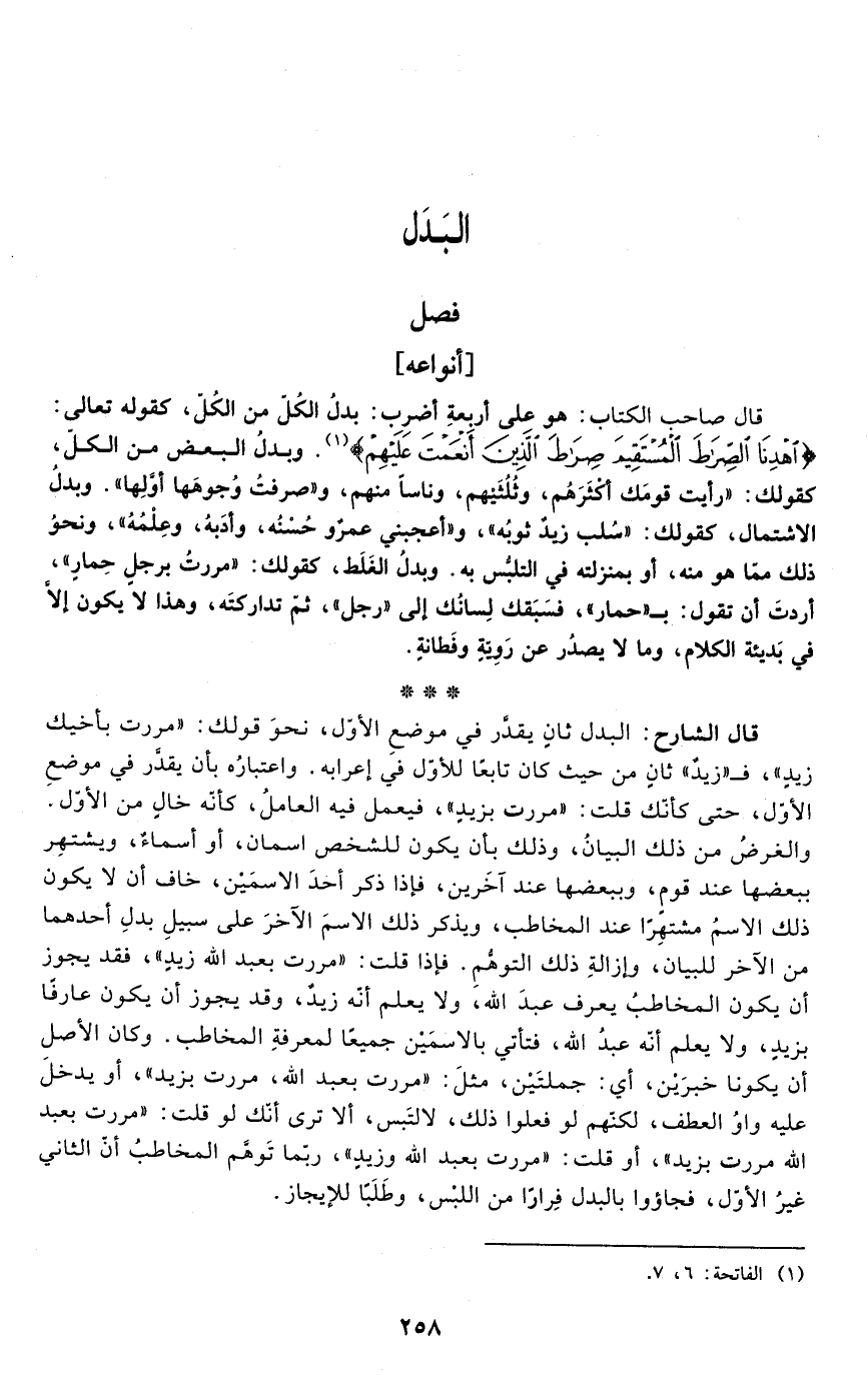 قال صاحب الكتاب: هو على أربعة أضرب: بدل الكل من الكل كقوله تعالى: {إهدنا الصراط المستقيم صراط الذين أنعمت عليهم} (¬1). وبدل البعض من الكل, كقولك: "رأيت قومك أكثرهم وثلثيهم, وناساً منهم، و"صرفت وجوهها أولها". وبدل الاشتمال كقولك سلب زيد ثوبه، وأعجبني عمرو حسنه، وأدبه وعلمه، مما هو منه أو بمنزلته في التلبس به. وبدل الغلط, كقولك: "مررت برجل حمار"، أردت أن تقول: بـ "حمار"، فسبقك لسانك إلى "رجل"، ثم تداركته, وهذا لا يكون إلا في بداية الكلام وما لا يصدر عن روية وفطانة.