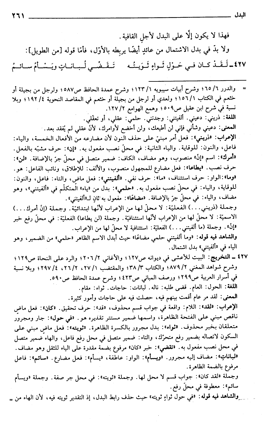 427 - التخريج: البيت للأعشى في ديوانه ص 127؛ والأغاني 2/ 206؛ والرد على النحاة ص 129؛ وشرح شواهد المغني 2/ 879؛ والكتاب 3/ 38؛ والمقتضب 1/ 27، 2/ 26، 4/ 297؛ وبلا نسبة في أسرار العربية ص 299؛ ورصف المباني ص 423؛ وشرح عمدة الحافظ ص 590.