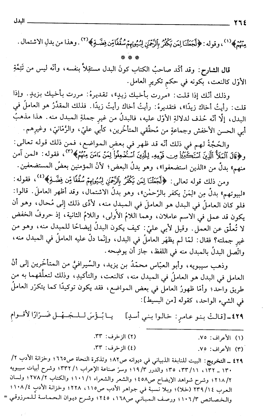 ومن ذلك قوله تعالى: {لَجَعَلْنَا لِمَنْ يَكْفُرُ بِالرَّحْمَنِ لِبُيُوتِهِمْ سُقُفًا مِنْ فِضَّةٍ} (¬4)، فقوله: "لبيوتهم" بدلٌ مِن "لِمَنْ يكفر بالرَّحمن"، وهو بدلُ الاشتمال، وقد أظهر العاملَ. قالوا: فلو كان العاملُ في البدل هو العاملَ في المبدل منه، لأدَّى ذلك إِلى مُحال، وهو أن يكون قد عمل في الاسم عاملان، وهما اللامُ الأُولى، واللامُ الثانية، إذ حروفُ الخفض لا تُعلَّق عن العمل. وقيل لأبي عليّ: كيف يكون البدلُ إيضاحًا للمبدل منه، وهو من غيرِ جملته؟ فقال: لمّا لم يظهَر العاملُ في البدل، وإنّما دلَّ عليه العاملُ في المبدل منه، واتصل البدلُ بالمبدل منه في اللفظ , جاز أن يوضِحه.