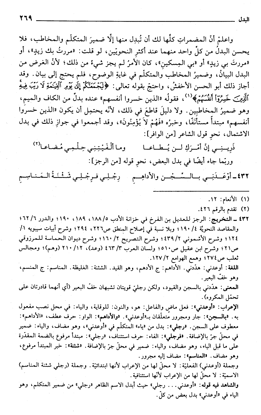 432 - أوْعَدَنِي بالسِّجن والأداهِمِ ... رِجلِي فرِجلِي شَثْنَةُ المَناسِمِ