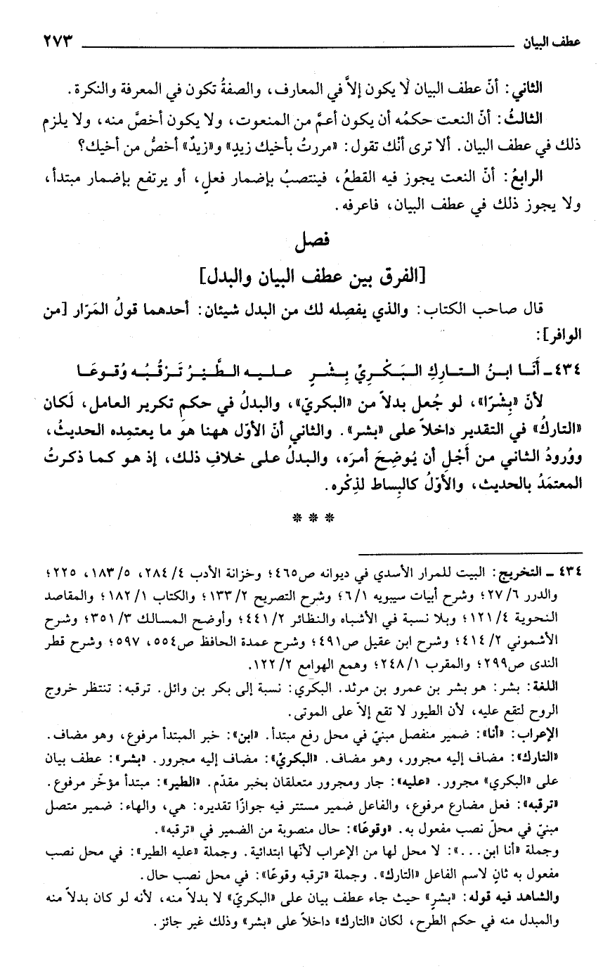 والشاهد فيه قوله: "بشرٍ" حيث جاء عطف بيان على "البكري" لا بدلًا منه, لأنه لو كان بدلًا منه والمبدل منه في حكم الطرح، لكان "التارك" داخلًا على "بشر" وذلك غير جائز.