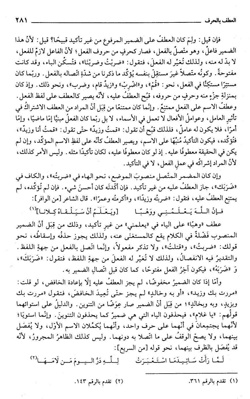 فإن قيل: ولِمَ كان العطفُ على الضمير المرفوع من غير تأكيد قبيحًا؟ قيل: لأنّ هذا الضمير فاعلٌ، وهو متصلٌ بالفعل، فصار كحرفٍ من حروف الفعل؛ لأنّ الفاعل لازمٌ للفعل، لا بدّ له منه، ولذلك تُغيَّر له الفعل، فتقول: "ضربْتُ وضربْنَا"، فتُسكِّن الباء، وقد كانت مفتوحةً. وكونُه متّصلًا غيرَ مستقِل بنفسه يُؤكِّد ما ذكرنا من شدّةِ اتصاله بالفعل. وربّما كان مستتِرًا مستكِنًّا في الفعل، نحو: "قُمْ"، و"اضْرِبْ" و"زيدٌ قام، وضرب"، ونحو ذلك. وإذ كان بمنزلةِ جزء منه وحرفٍ من حروفه، قبُح العطفُ عليه؛ لأنّه يصير كالعطف على لفظ الفعل. وعطفُ الاسم على الفعل ممتنِعٌ. وإنّما كان ممتنعًا من قِبَل أنّ المراد من العطف الاشتراكُ في تأثيرِ العامل، وعواملُ الأفعال لا تعمل في الأسماء، لا بل ربّما كان الفعلُ مبنيًّا إمّا ماضيًا، وإمّا أمرًا، فلا يكون له عاملٌ، فلذلك قبُح أن تقول: "قمتُ وزيدٌ" حتى تقول: "قمتُ أنا وزيدٌ"، فتُؤكِّده، فيكون التأكيدُ مُنبِّهًا على الاسم، ويصير العطفُ كأنه على لفظِ الاسم المؤكِّد، وإن لم يكن في الحقيقة معطوفًا عليه. إذ لو كان معطوفًا عليه، لكان تأكيدًا مثله. وليس الأمر كذلك، لأن المراد إشراكُه في عملِ الفعل، لا في التأكيد.