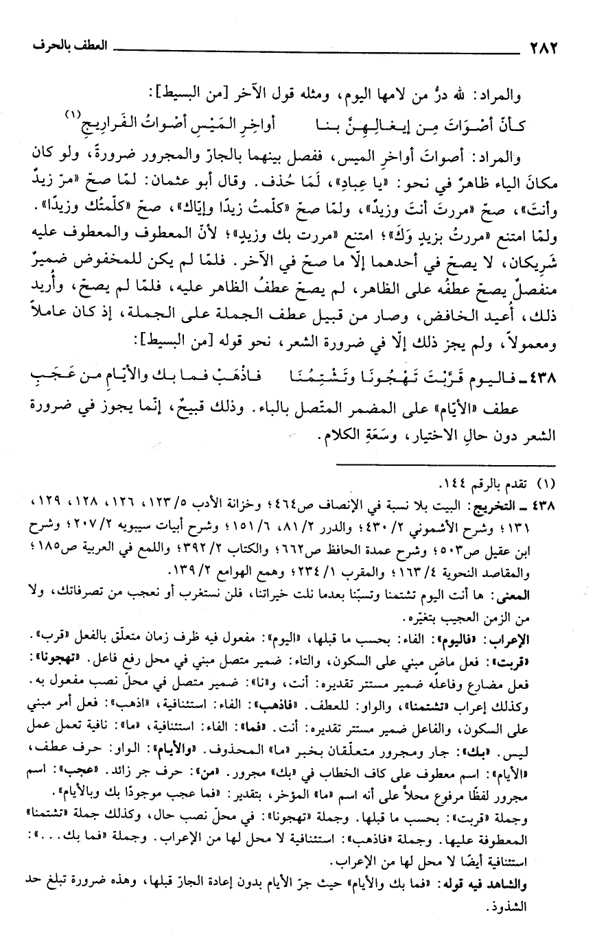 والمراد: أصواتَ أواخرِ الميس، ففصل بينهما بالجارّ والمجرور ضرورة، ولو كان مكانَ الياء ظاهرٌ في نحو: "يا عِبادِ"، لَمَا حُذف. وقال أبو عثمان: لما صحّ "مرّ زيدٌ وأنتَ"، صحّ "مررتَ أنتَ وزيدٌ"، ولمّا صحّ "كلّمتُ زيدًا وإيّاك"، صحّ "كلّمتُك وزيدًا". ولمّا امتنع "مررتُ بزيدٍ وَكَ"؛ امتنع "مررت بك وزيدٍ"؛ لأنّ المعطوف والمعطوف عليه شَرِيكان، لا يصح في أحدهما إلَّا ما صحّ في الآخر. فلمّا لم يكن للمخفوض ضميرٌ منفصلٌ يصح عطفُه على الظاهر، لم يصح عطفُ الظاهر عليه، فلمّا لم يصحّ، وأُريد ذلك، أُعيد الخافض، وصار من قبيل عطف الجملة على الجملة، إذ كان عاملًا ومعمولًا، ولم يجز ذلك إلا في ضرورة الشعر، نحو قوله [من البسيط]: