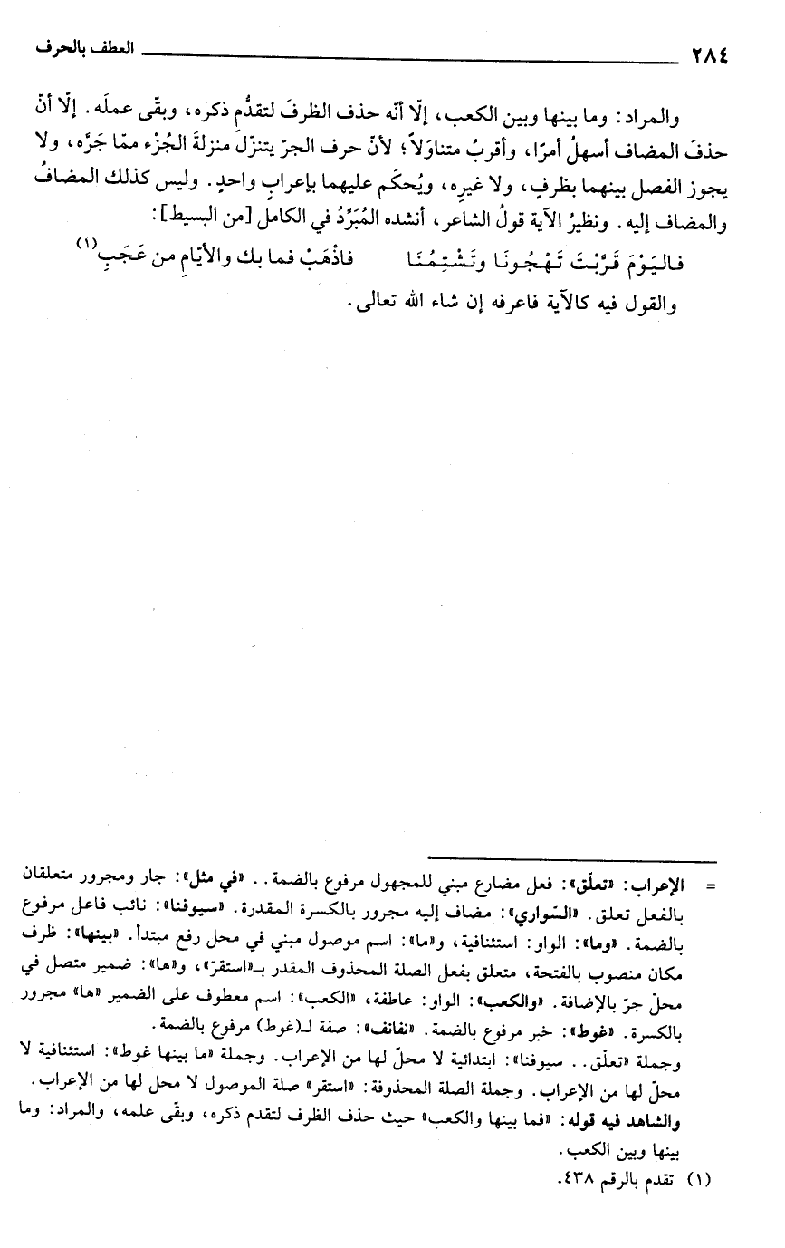والمراد: وما بينها وبين الكعب، إلّا أنّه حذف الظرفَ لتقدُّمِ ذكره، وبقى عملَه. إلَّا أنّ حذفَ المضاف أسهلُ أمرًا، وأقربُ متناوَلًا؛ لأن حرف الجرّ يتنزّل منزلةَ الجُزْء ممّا جَرَّه، ولا يجوز الفصل بينهما بظرفٍ، ولا غيرِه، ويُحكَم عليهما بإعرابٍ واحدٍ. وليس كذلك المضافُ والمضاف إليه. ونظيرُ الآية قولُ الشاعر، أنشده المُبَرِّدُ في الكامل [من البسيط]: