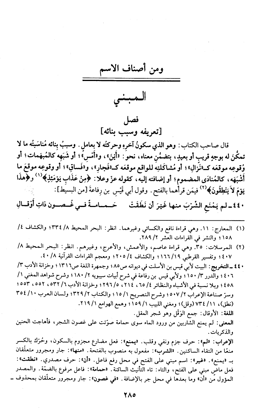 قال صاحب الكتاب: وهو الذي سكونُ آخرِهِ وحركتُه لا بعاملٍ. وسببُ بِنائه مُناسَبتُه ما لا تمكُّنَ له بوجهٍ قريب أو بعيدٍ، بتضمُّنِ معناه، نحو: "أَيْنَ"، و"أَمْسِ"؛ أو شَبَهِه كالمُبهَمات؛ أو وُقوعِه موقعَه كـ "نَزالِ"؛ أو مُشاكَلتِه للواقع موقعَه كـ "فَجارِ"، و"فَساقِ"؛ أو وقوعِه موقعَ ما أَشبَهَه، كالمُنادَى المضموم؛ أو إضافته إليه، كقوله عزّ وعلا: {مِنْ عَذَابِ يَوْمِئِذٍ} (¬1) و {هَذَا يَوْمُ لَا يَنْطِقُونَ} (¬2) فيمَن قرأهما بالفتح. وقول أبي قَيْسِ بن رِفاعةَ [من البسيَط]: