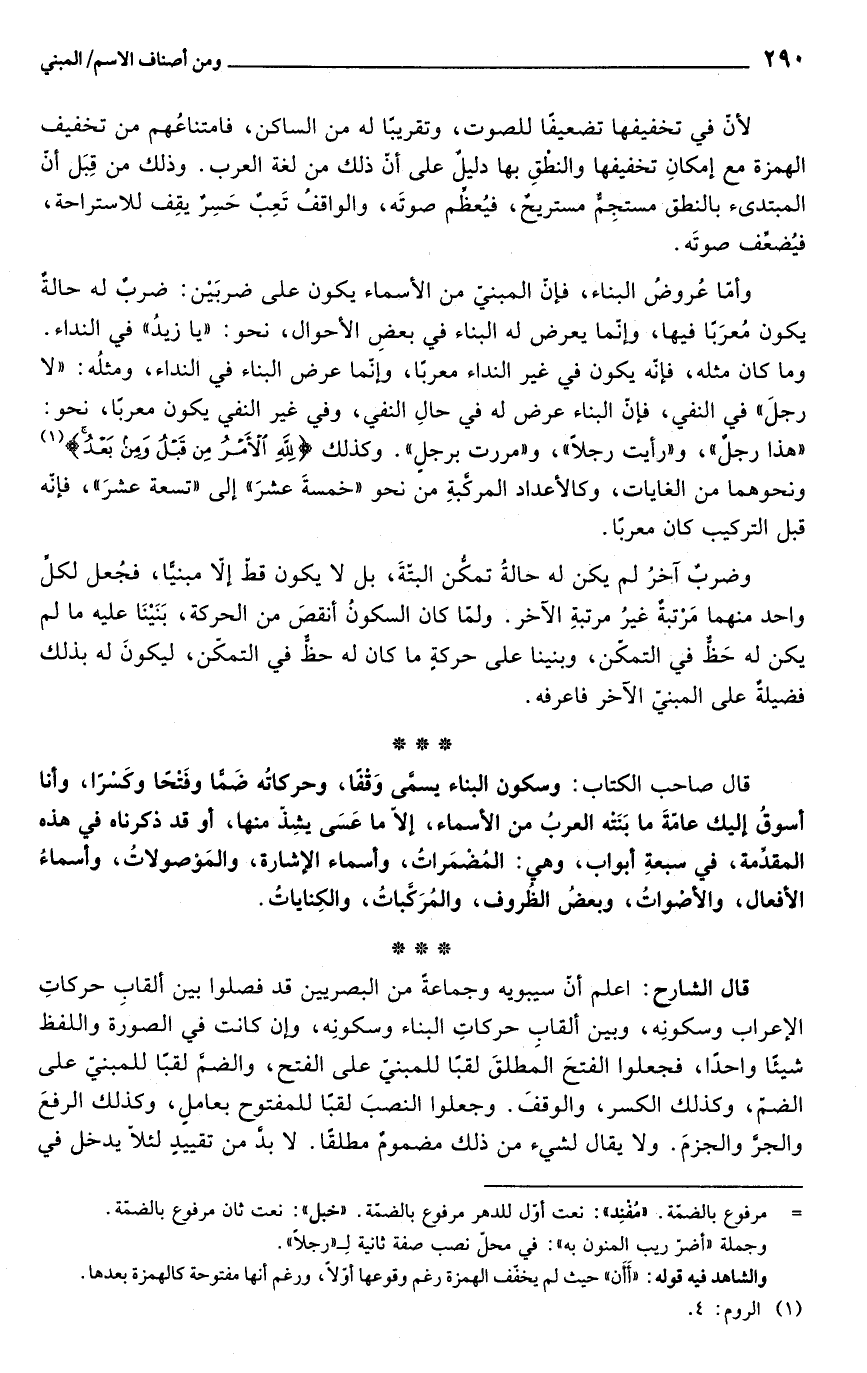 قال الشارح: اعلم أنّ سيبويه وجماعةٌ من البصريين قد فصلوا بين ألقابِ حركاتِ الإعراب وسكونِه، وبين ألقاب حركاتِ البناء وسكونِه، وإن كانت في الصورة واللفظ شيئًا واحدًا، فجعلوا الفتحَ المَطلقَ لقبًا للمبنيّ على الفتح، والضمَّ لقبًا للمبنيّ على الضمّ، وكذلك الكسر، والوقفَ. وجعلوا النصبَ لقبًا للمفتوح بعامل، وكذلك الرفعَ والجرَّ والجزمَ. ولا يقال لشيء من ذلك مضمومٌ مطلقًا. لا بدَّ من تقييدٍ لئلا يدخل في