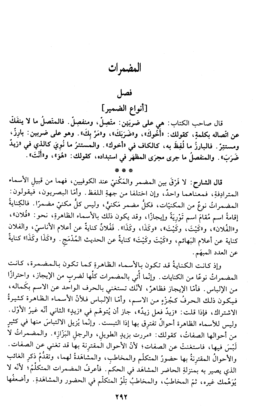 قال صاحب الكتاب: وهي على ضربين متصل ومنفصل. فالمتصل ما لا ينفك عن اتصاله بكلمة، كقولك: أخوك, وضربك, ومر بك. وهو على ضربين بارزٌ, ومستترٌ. فالبارز ما لفظ به, بالكاف في "أخوك". والمستتر ما نوي كالذي في "زيدٌ ضرب". والمنفصل ما جرى مجرى المظهر في استبداده, كقولك: "هو", و"أنت".