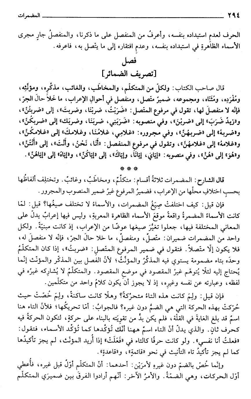 قال صاحب الكتاب: ولكل من المتكلم والمخاطب والغائب مذكره ومؤنثه ومفرده مثناه ومجموعه ضمير متصل ومنفصل في أحوال الإعراب، ما خلا حال الجر فإنه لا منفصل لها. تقول في مرفوع المتصل "ضربت ضربنا وضربت", إلى "ضربتن"، وزيد ضرب إلى ضربن. وفي منصوبه "ضربني ضربنا وضربك" إلى "ضربكن" وضربه إلى "ضربهن". وفي مجروره: "غلامي وغلامنا وغلامك" إلى "غلامكن و"غلامه" إلى "غلامهن", وتقول في مرفوع المنفصل: "أنا, نحن, وأنت", إلى "أنتن", و"هو" إلى "هن", وفي منصوبه: "إياي, إيانا, وإياك", إلى "إياكن", و"إياه" إلى "إياهن".