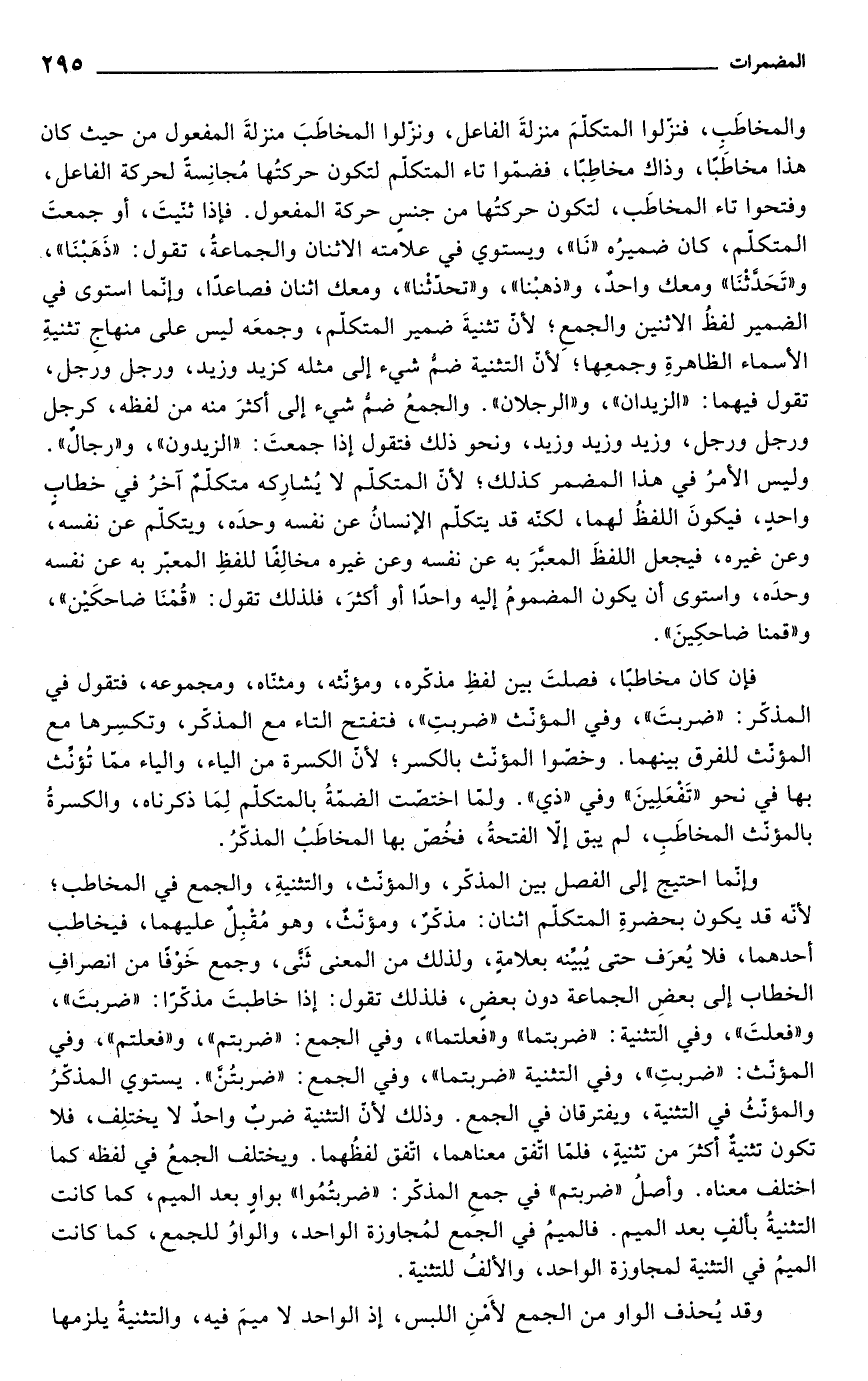 والمخاطَبِ، فنزّلوا المتكلّمَ منزلةَ الفاعل، ونزّلوا المخاطَبَ منزلةَ المفعول من حيث كان هذا مخاطبًا، وذاك مخاطِبًا، فضمّوا تاء المتكلّم لتكون حركتُها مُجانِسة لحركة الفاعل، وفتحوا تاء المخاطَب، لتكون حركتُها من جنسٍ حركة المفعول. فإذا ثنيتَ، أو جمعتَ المتكلّم، كان ضميرُه "نَا"، ويستوي في علامته الاثنان والجماعةُ، تقول: "ذَهَبْنَا"، و"تَحَدَّثْنَا" ومعك واحدٌ، و"ذهبْنا"، و"تحدّثْنا"، ومعك اثنان فصاعدًا، وإنّما استوى في الضمير لفظُ الاثنين والجمع؛ لأنّ تثنيةَ ضمير المتكلّم، وجمعَه ليس على منهاجِ تثنيةِ الأسماء الظاهرةِ وجمعِها؛ لأنّ التثنية ضمُّ شيء إلى مثله كزيد وزيد، ورجل ورجل، تقول فيهما: "الزيدان"، و"الرجلان". والجمعُ ضمُّ شيء إلى أكثرَ منه من لفظه، كرجل ورجل ورجل، وزيد وزيد وزيد، ونحو ذلك فتقول إذا جمعتَ: "الزيدون"، و"رجالٌ". وليس الأمرُ في هذا المضمر كذلك؛ لأنّ المتكلّم لا يُشارِكه متكلّمٌ آخرُ في خطابٍ واحدٍ، فيكونَ اللفظُ لهما، لكنّه قد يتكلّم الإنسانُ عن نفسه وحدَه، ويتكلّم عن نفسه، وعن غيره، فيجعل اللفظَ المعبَّرَ به عن نفسه وعن غيره مخالِفًا للفظِ المعبّر به عن نفسه وحدَه، واستوى أنّ يكون المضمومُ إليه واحدًا أو أكثرَ، فلذلك تقول: "قُمْنَا ضاحكَيْن"، و"قمنا ضاحكِينَ".