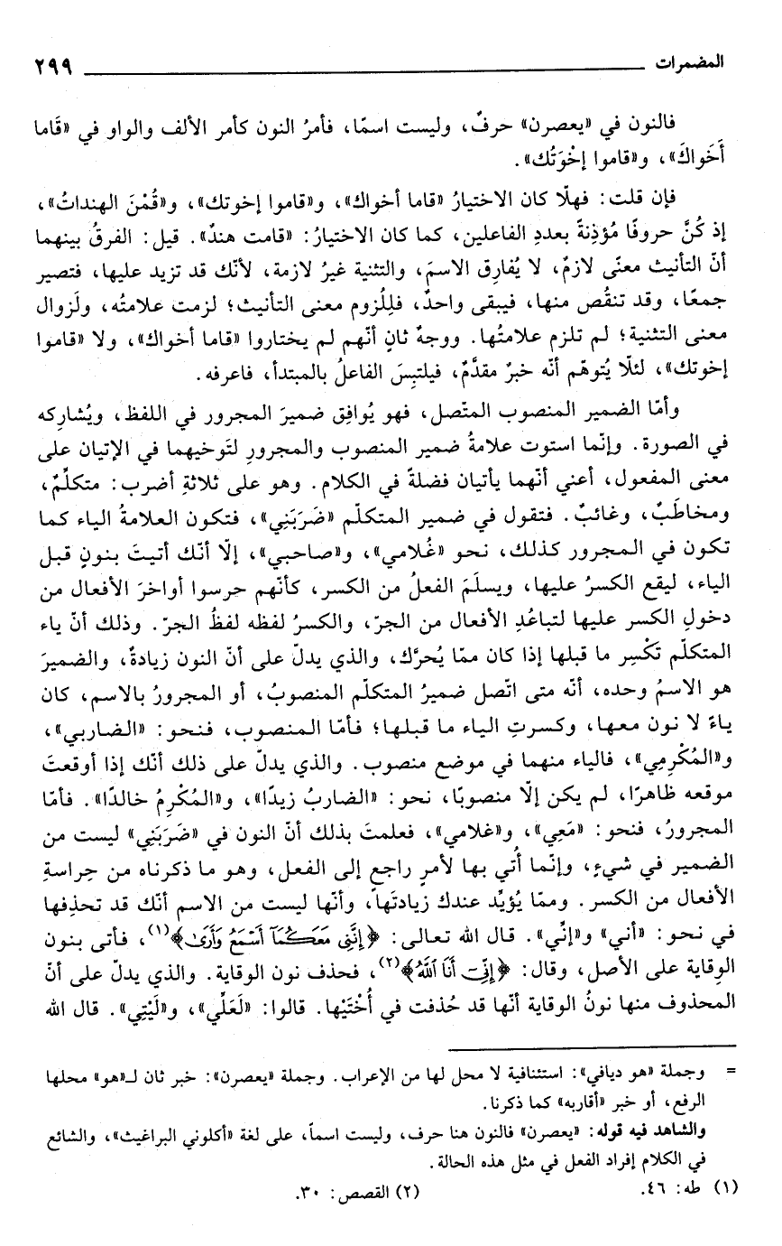 وأمّا الضمير المنصوب المتّصل، فهو يُوافِق ضميرَ المجرور في اللفظ، ويُشارِكه في الصورة. وإنّما استوت علامةُ ضمير المنصوب والمجرورِ لتَوخيهما في الإتيان على معنى المفعول، أعني أنّهما يأتيان فضلة في الكلام. وهو على ثلاثةِ أضرب: متكلِّمٌ، ومخاطَبٌ، وغائبٌ. فتقول في ضمير المتكلّم "ضَرَبَنِي"، فتكون العلامةُ الياء كما تكون في المجرور كذلك، نحو "غُلامي"، و"صاحبي"، إلّا أنّك أتيتَ بنونٍ قبل الياء، ليقع الكسرُ عليها، ويسلَمَ الفعلُ من الكسر، كأنّهم حرسوا أواخرَ الأفعال من دخولِ الكسر عليها لتباعُدِ الأفعال من الجرّ، والكسرُ لفظه لفظُ الجرّ. وذلك أنّ ياء المتكلّم تكْسِر ما قبلها إذا كان ممّا يُحرك، والذي يدلّ على أنّ النون زيادةٌ، والضميرَ هو الاسمُ وحده، أنّه متى اتصل ضميرُ المتكلّم المنصوبُ، أو المجرورُ بالاسم، كان ياء لا نون معها، وكسرتِ الياء ما قبلها؛ فأمّا المنصوب، فنحو: "الضاربي"، و"المُكْرِمِي"، فالياء منهما في موضع منصوب. والذي يدل على ذلك أنّك إذا أوقعتَ موقعه ظاهرًا، لم يكن إلا منصوبًا، نحو: "الضاربُ زيداً"، و"المُكرِمُ خالدًا". فأمّا المجرورُ، فنحو: "مَعِي"، و"غلامي"، فعلمتَ بذلك أنْ النون في "ضَرَبَنِي" ليست من الضمير في شيءٍ، وإنّما أُتي بها لأمر راجع إلى الفعل، وهو ما ذكرناه من حِراسةِ الأفعال من الكسر. وممّا يُؤيِّد عندك زيادتَها، وأنّها ليست من الاسم أنّك قد تحذِفها في نحو: "أني" و"إنِّي". قال الله تعالى: {إِنَّنِي مَعَكُمَا أَسْمَعُ وَأَرَى} (¬1)، فأتى بنون الوِقاية على الأصل، وقال: {إِنَّنِي أَنَا اللَّهُ} (¬2)، فحذف نون الوقاية. والذي يدلّ على أنّ المحذوف منها نونُ الوقاية أنّها قد حُذفت في أُخْتَيْها. قالوا: "لَعَلِّي"، و"لَيتِي". قال الله