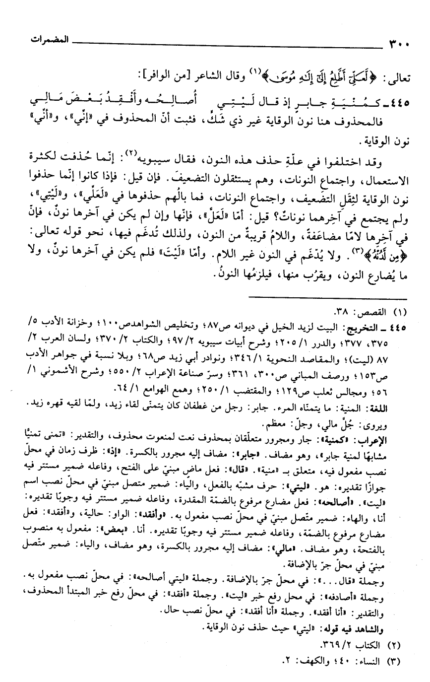 445 - التخريج: البيت لزيد الخيل في ديوانه ص 87؛ وتخليص الشواهد ص 100؛ وخزانة الأدب 5/ 375، 377؛ والدرر 1/ 205؛ وشرح أبيات سيبويه 2/ 97؛ والكتاب 2/ 370؛ ولسان العرب 2/ 87 (ليت)؛ والمقاصد النحوية 1/ 346، ونوادر أبي زيد ص 68؛ وبلا نسبة في جواهر الأدب ص 153؛ ورصف المباني ص 300، 361؛ وسرّ صناعة الإعراب 2/ 550؛ وشرح الأشموني 1/ 56؛ ومجالس ثعلب ص 129؛ والمقتضب 1/ 250؛ وهمع الهوامع 1/ 64.
