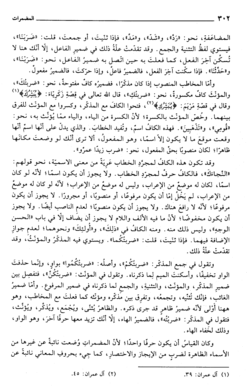 وتقول في جمع المذكّر: "ضربتُكُم"، وأصلُه: "ضربتُكُمُوا" بواوٍ، وإنّما حذفتَ الواو تخفيفًا، وأسكنتَ الميم لِما ذكرناه. وتقول في المؤنّث: "ضربتُكُنَّ"، فتفصِل بين ضميرِ المذكّر، والمؤنّث، والتثنيةِ، والجمعِ لما ذكرناه في ضمير المرفوع. وأمّا ضميرُ الغائب، فإنّك تُثنِّيه، وتجمعُه، وتفرِق بين مذكّره ومؤنّثه كما فعلتَ مع المخاطب، وهو ههنا أَوْلى لأنّه ضميرُ ظاهرٍ قد جرى ذكره. والظاهرُ يُثنَّى، ويُجْمَع، ويُذكَّر، ويُؤنَّث، فتقول في المذكّر: "ضربْتُه"، فالضميرُ الهاء، إلّا أنّك تزيد معها حرفًا آخرَ، وهو الواو، وذلك لخَفاء الهاء.