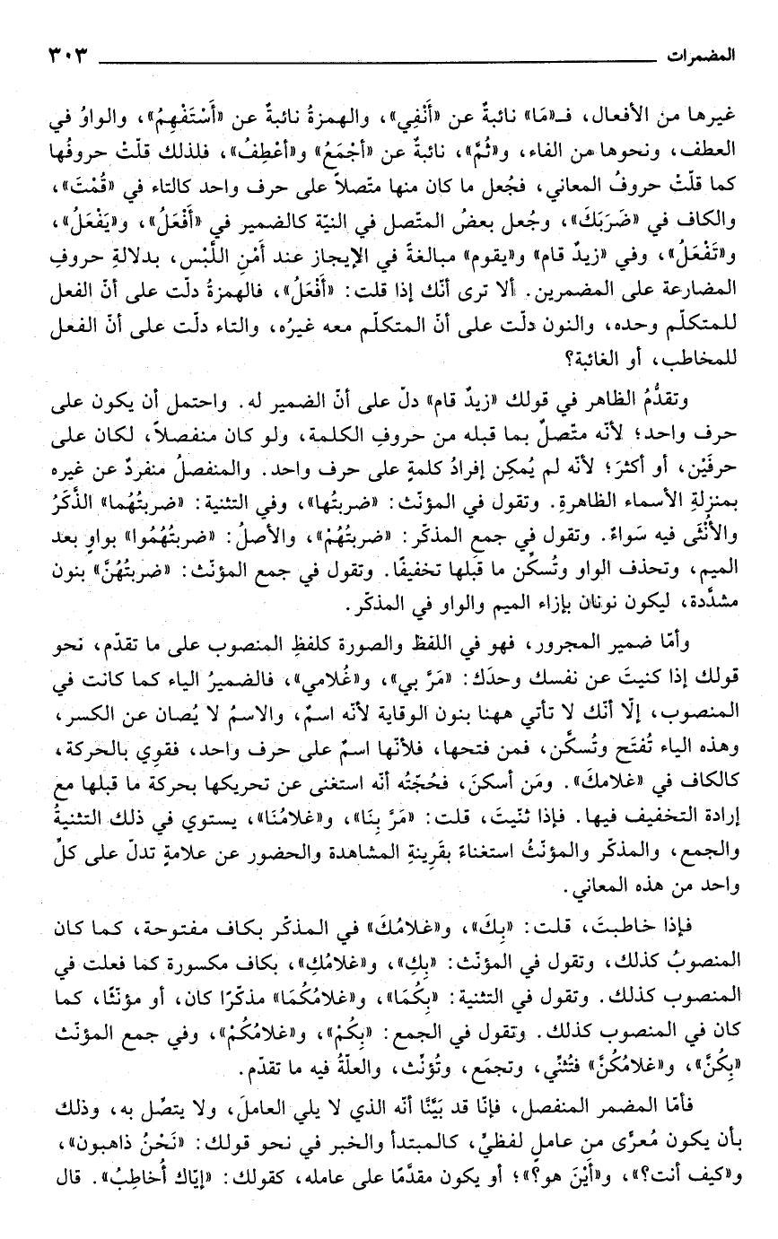 وتقدُّمُ الظاهر في قولك "زيدٌ قام" دلّ على أنّ الضمير له. واحتمل أن يكون على حرف واحد؛ لأنّه متصلٌ بما قبله من حروفِ الكلمة، ولو كان منفصلاً، لكان على حرفَيْن، أو أكثرَ؛ لأنّه لم يُمكِن إفرادُ كلمةٍ على حرف واحد. والمنفصلُ منفردٌ عن غيره بمنزلةِ الأسماء الظاهرةِ. وتقول في المؤنّث: "ضربتُها"، وفي التثنية: "ضربتُهُما" الذَّكَرُ والأُنْثَى فيه سَواءٌ. وتقول في جمع المذكّر: "ضربتُهُمْ"، والأصلُ: "ضربتُهُمُوا" بواوٍ بعد الميم، وتحذف الواو وتُسكّن ما قبَلها تخفيفًا. وتقول في جمع المؤنّث: "ضربتُهُنَّ" بنون مشدَّدة، ليكون نونان بإزاء الميم والواو في المذكّر.