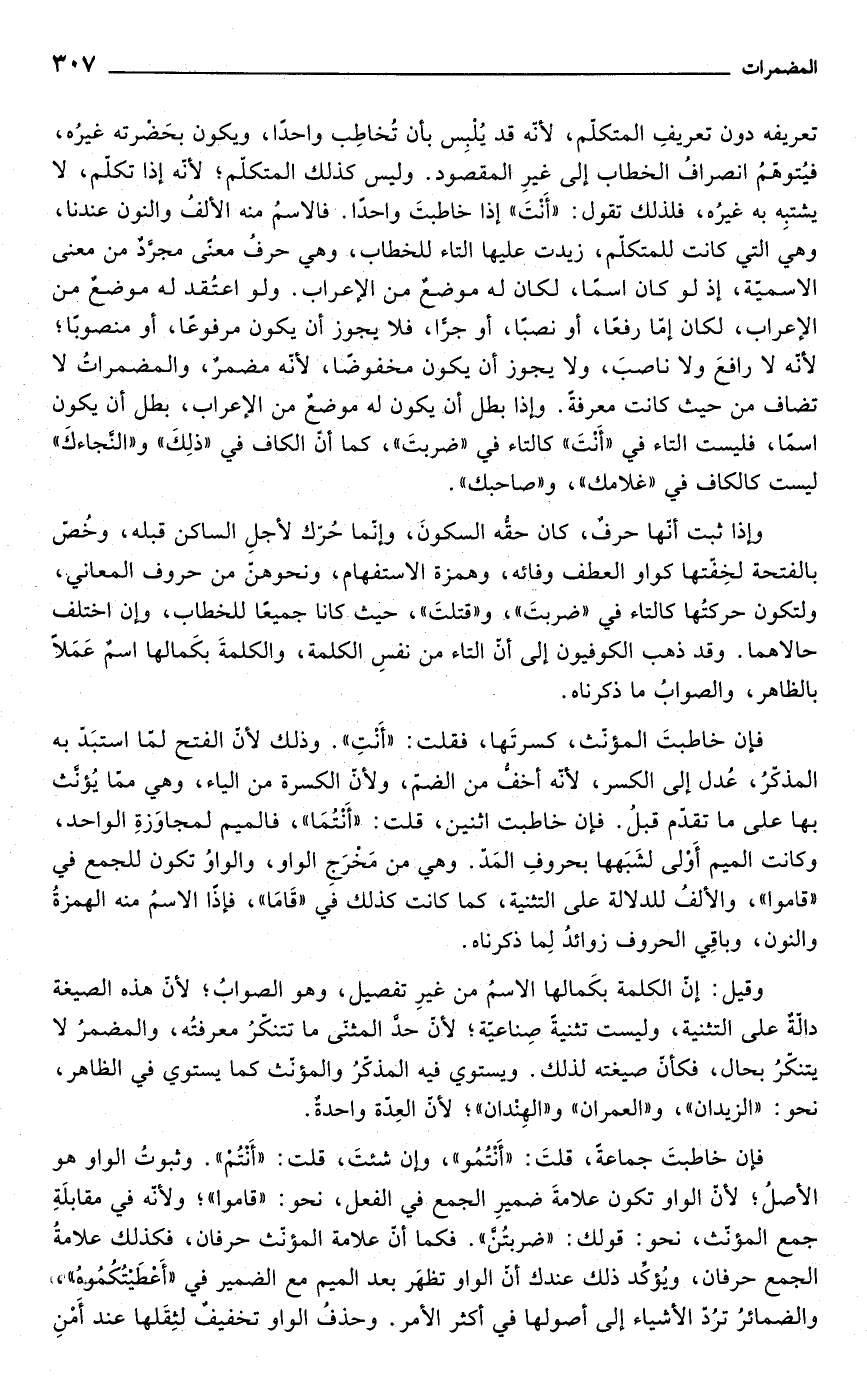 فإنّ خاطبتَ المؤنّث، كسرتَها، فقلت: "أَنْتِ". وذلك لأنّ الفتح لمّا استبَدّ به المذكّرُ، عُدل إلى الكسر, لأنّه أخفُّ من الضمّ، ولأنّ الكسرة من الياء، وهي ممّا يُؤنَّث بها على ما تقدّم قبلُ. فإنّ خاطبت اثنين، قلت: "أنْتُمَا"، فالميم لمجاوَزةِ الواحد، وكانت الميم أَوْلى لشَبَهها بحروفِ المَدّ. وهي من مَخْرَجِ الواو، والواوُ تكون للجمع في "قاموا"، والألفُ للدلالة على التثنية، كما كانت كذلك في "قَامَا"، فإذا الاسمُ منه الهمزةُ والنون، وباقِي الحروف زوائدُ لِما ذكرناه.