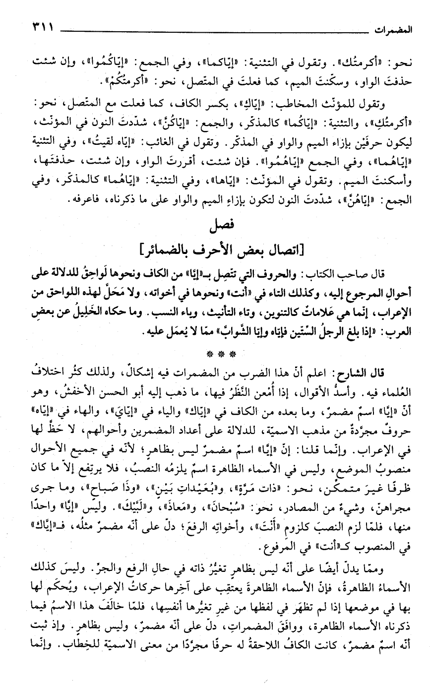 قال الشارح: اعلم أن هذا الضرب من المضمرات فيه إشكالٌ، ولذلك كثُر اختلافُ العُلماء فيه. وأسدُّ الأقوال، إذا أُمْعن النَّظَرُ فيها، ما ذهب إليه أبو الحسن الأخفشُ، وهو أن "إيّا" اسمٌ مضمرٌ، وما بعده من الكاف في "إيّاك" والياء في "إيّايَ"، والهاء في "إيّاه" حروف مجرَّدةٌ من مذهب الاسميّة، للدلالة على أعداد المضمرين وأحوالهم، لا حَظَّ لها في الإعراب. وإنّما قلنا: إن "إيَّا" اسم مضمرٌ ليس بظاهر؛ لأنّه في جميع الأحوال منصوبُ الموضعٍ، وليس في الأسماء الظاهرة اسمٌ يلزمُه النصبُ، فلا يرتِفع إلّا ما كان ظرفًا غيرَ متمكِّن، نحو: "ذات مَرَّةٍ"، و"بُعَيْداتِ بَيْنٍ"، "وذَا صَباحٍ"، وما جرى مجراهنّ، وشيء من المصادر، نحو: "سُبْحانَ"، و"مَعاذَ"، و"لَبَّيْكَ". وليس "إيَّا" واحدًا منها، فلمّا لزم النصبَ كلزومِ "أَنْتَ"، وأخواتِه الرفعَ؛ دلّ على أنّه مضمرٌ مثلُه، فـ "إيَّاك" في المنصوب كـ "أنت" في المرفوع.
