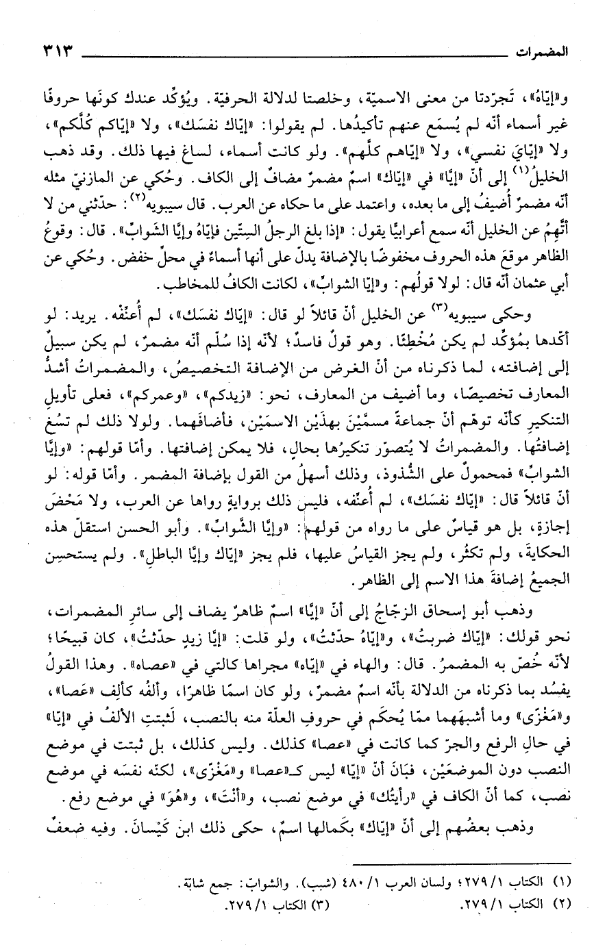 و"إيّاهُ"، تَجرّدتا من معنى الاسميّة، وخلصتا لدلالة الحرفيّة. ويُؤكد عندك كونَها حروفًا غير أسماء أنّه لم يُسمَع عنهم تأكيدُها. لم يقولوا: "إيّاك نفسَك"، ولا "إيّاكم كُلَّكم"، ولا "إيّايَ نفسي"، ولا "إيّاهم كلَّهم". ولو كانت أسماء، لساغ فيها ذلك. وقد ذهب الخليلُ (¬1) إلى أنّ "إيَّا" في "إياك" اسمٌ مضمرٌ مضافٌ إلى الكاف. وحُكي عن المازنيّ مثله أنه مضمرٌ أُضيفُ إلى ما بعده، واعتمد على ما حكاه عن العرب. قال سيبويه (¬2): حدّثني من لا أتَّهِمُ عن الخليل أنَّه سمع أعرابيًّا يقول: "إذا بلغ الرجلُ السِتّين فإيّاهُ وإيَّا الشَوابِّ". قال: وقوعُ الظاهر موقع هذه الحروف مخفوضًا بالإضافة يدلّ على أنها أسماءٌ في محلِّ خفض. وحُكي عن أبي عثمان أنّه قال: لولا قولُهم: و"إيّا الشوابِّ"، لكانت الكافُ للمخاطب.