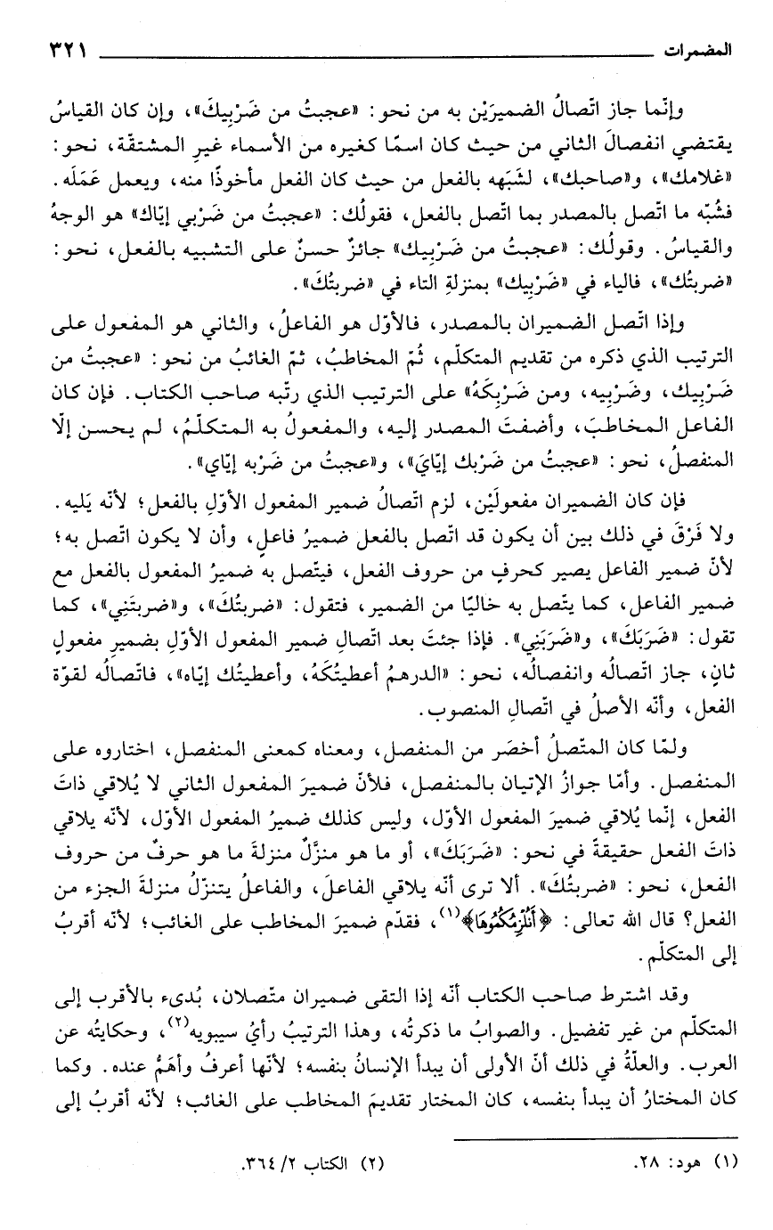 وإذا اتّصل الضميران بالمصدر، فالأوّل هو الفاعلُ، والثاني هو المفعول على الترتيب الذي ذكره من تقديم المتكلّم، ثُمّ المخاطبُ، ثمّ الغائبُ من نحو: "عجبتُ من ضَرْبِيك، وضَرْبِيه، ومن ضَرْبِكَهُ" على الترتيب الذي رتّبه صاحب الكتاب. فإن كان الفاعل المخاطبَ، وأضفتَ المصدر إليه، والمفعولُ به المتكلّمُ، لم يحسن إلّا المنفصلُ، نحو: "عجبتُ من ضَرْبك إيّايَ"، و"عجبتُ من ضَرْبه إيّاي".
