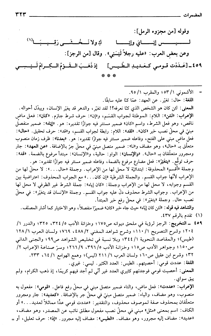 459 - التخريج: الرجز لرؤبة في ملحق ديوانه ص 175؛ وخزانة الأدب 5/ 324، 325؛ والدرر 1/ 204؛ وشرح التصريح 1/ 110؛ وشرح شواهد المغني 2/ 488، 769؛ ولسان العرب 6/ 128 (طيس)؛ والمقاصد النحوية 1/ 344؛ وبلا نسبة في تخليص الشواهد ص 99؛ والجنى الداني ص 150؛ وجواهر الأدب ص 15, وخزانة الأدب 5/ 396، 9/ 266؛ وسرّ صناعة الإعراب 2/ 32؛ وشرح ابن عقيل ص 60؛ ولسان العرب 6/ 211 (ليس)؛ وهمع الهوامع 1/ 64، 233.