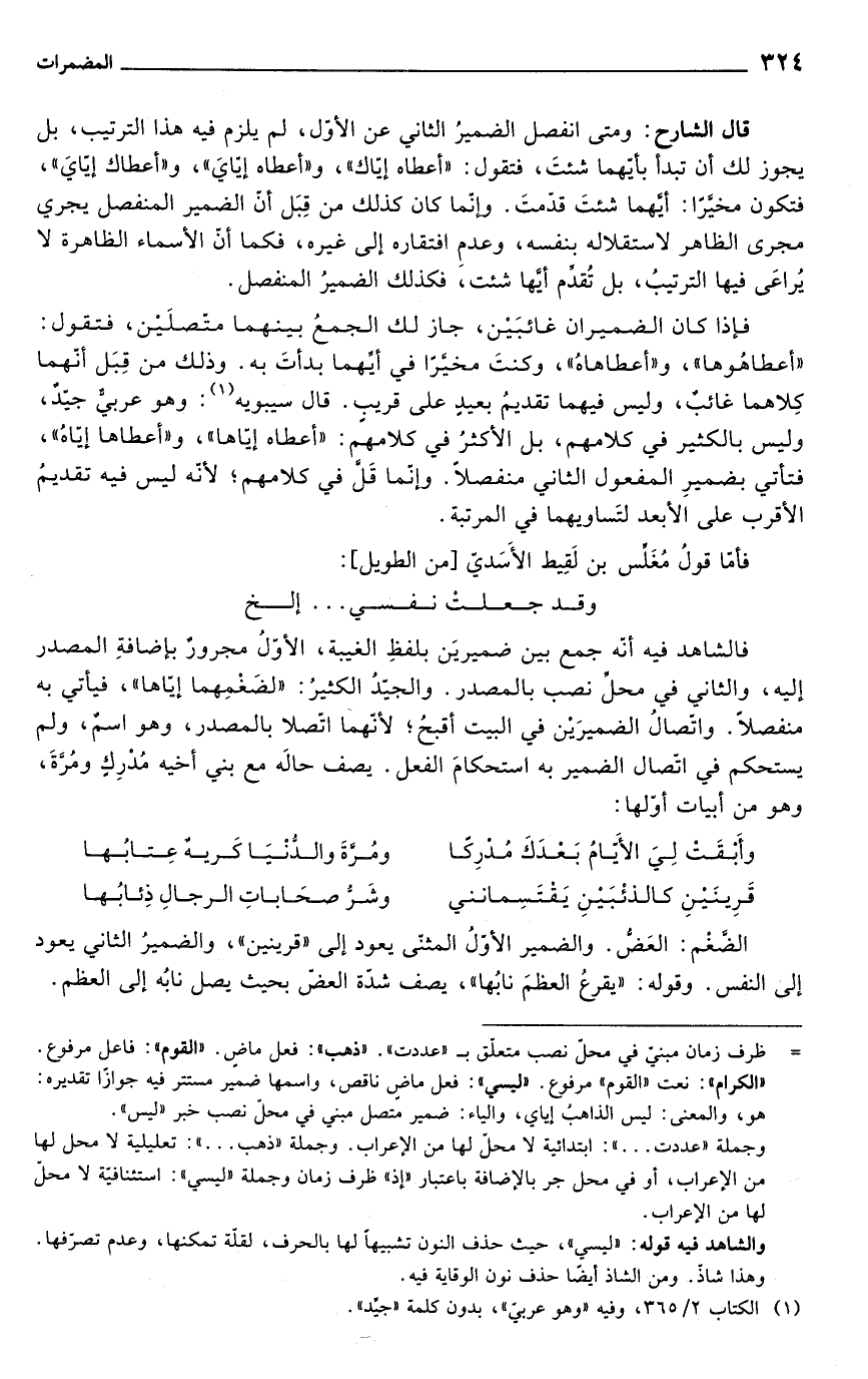 فالشاهد فيه أنّه جمع بين ضميريَن بلفظِ الغيبة، الأوّلُ مجرورٌ بإضافةِ المصدر إليه، والثاني في محلِّ نصب بالمصدر. والجيدُ الكثيرُ: "لضغْمِهما إيّاها"، فيأتي به منفصلاً. واتّصالُ الضميرَيْن في البيت أقبحُ؛ لأنّهما اتّصلا بالمصدر، وهو اسمٌ، ولم يستحكم في اتّصال الضمير به استحكامَ الفعل. يصف حالَه مع بني أخيه مُدْرِكٍ ومُرَّةَ، وهو من أبيات أوّلها: