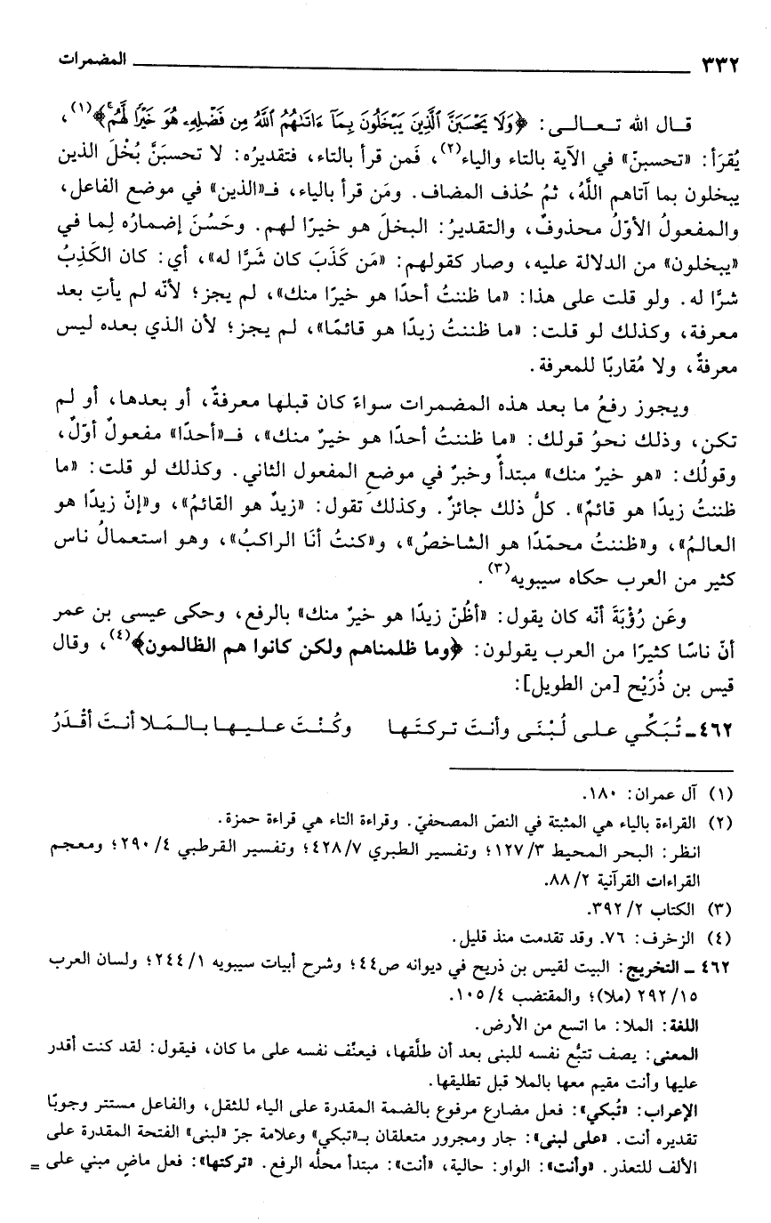 قال الله تعالى: {وَلَا يَحْسَبَنَّ الَّذِينَ يَبْخَلُونَ بِمَا آتَاهُمُ اللَّهُ مِنْ فَضْلِهِ هُوَ خَيْرًا لَهُمْ} (¬1)، يُقرَأ: "تحسبنّ" في الآية بالتاء والياء (¬2)، فَمن قرأ بالتاء، فتقديرُه: لا تحسبَنَّ بُخْلَ الذين يبخلون بما آتاهم الله، ثمُ حُذف المضاف. ومَن قرأ بالياء، فـ "الذين" في موضع الفاعل، والمفعولُ الأوَّل محذوفٌ، والتقديرُ: البخلَ هو خيرًا لهم. وحَسُنَ إضمارُه لِما في "يبخلون" من الدلالة عليه، وصار كقولهم: "مَن كَذَبَ كان شَرًّا له"، أي: كان الكَذِبُ شرًّا له. ولو قلت على هذا: "ما ظننتُ أحدًا هو خيرًا منك"، لم يجز؛ لأنّه لم يأتِ بعد معرفة، وكذلك لو قلت: "ما ظننتُ زيدًا هو قائمًا" لم يجز؛ لأنّ الذي بعده ليس معرفةٌ، ولا مُقاربًا للمعرفة.
