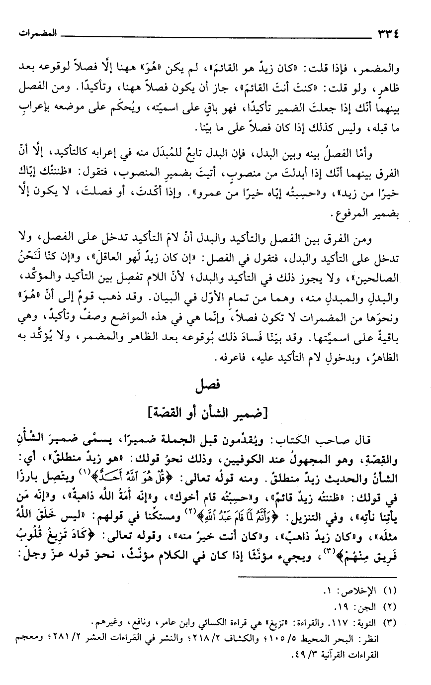 قال صاحب الكتاب: ويقدمون قبل الجملة ضميراً يسمى ضمير الشأن والقصة, وهو المجهول عند الكوفيين, وذلك نحو قولك: هو زيد منطلق أي الشأن والحديث زيد منطلق. ومنه قوله عز وجل: {قل هو الله أحد} (¬1) ويتصل بارزاً في قولك: "ظننته زيد قائم"، و"حسبته قام أخوك"، و"إنه أمة الله ذاهبةٌ"، وإنه يأتنا نأته"، وفي التنزيل: {وأنه لما قام عبد الله} (¬2)، ومستكناً في قولهم "ليس خلق الله مثله", و"كان زيد ذاهب"، و"كان أنت خير منه"، وقوله تعالي: {كاد تزيغ قلوب فريق منهم} (¬3) , ويجيء مؤنثاً إذا كان في الكلام مؤنث نحو قوله تعالى: