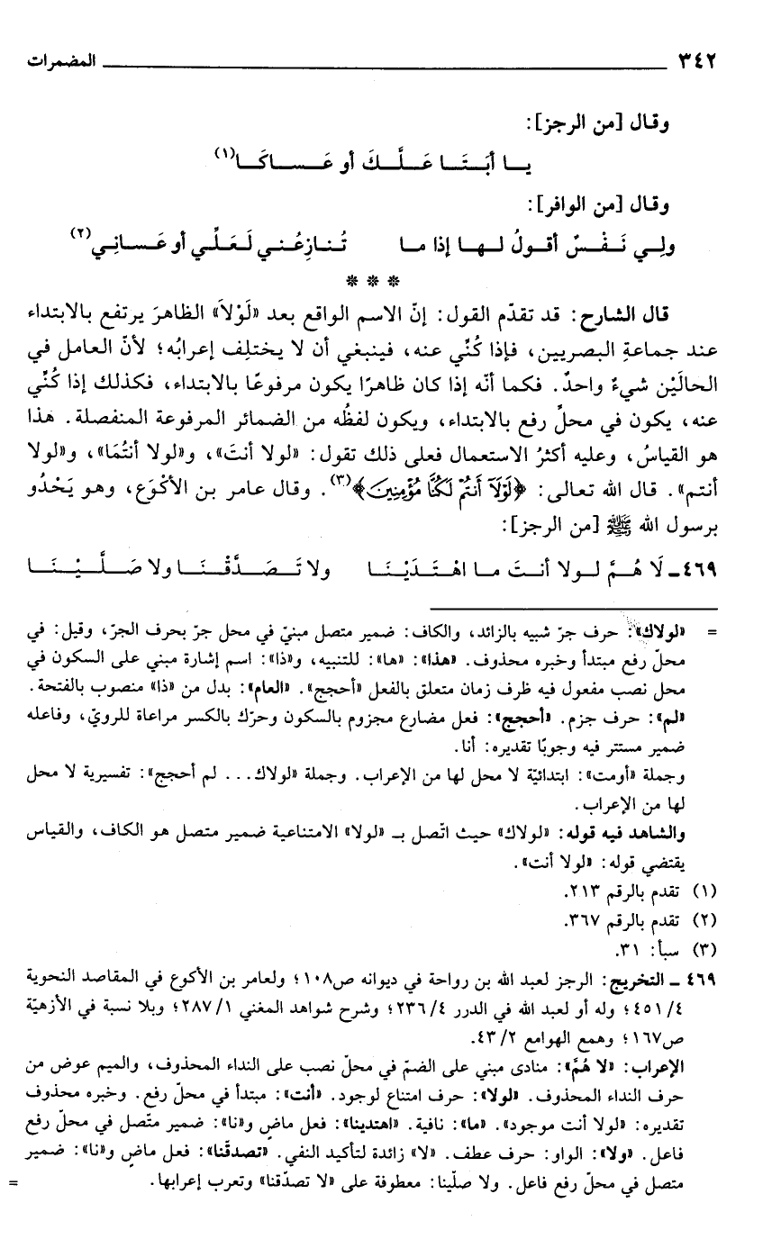 قال الشارح: قد تقدم القول: إنّ الاسم الواقع بعد "لَولاَ" الظاهرَ يرتفع بالابتداء عند جماعةِ البصريين، فإذا كُني عنه، فينبغي أن لا يختلِف إعرابُه؛ لأن العامل في الحالَين شيءٌ واحدٌ. فكما أنه إذا كان ظاهرًا يكون مرفوعًا بالابتداء، فكذلك إذا كُني عنه، يكون في محل رفع بالابتداء، ويكون لفظُه من الضمائر المرفوعة المنفصلة. هذا هو القياسُ، وعليه أكثرُ الاستعمال فعلى ذلك تقول: "لولا أنتَ"، و"لولا أنتُمَا"، و"لولا أنتم". قال الله تعالى: {لَوْلَا أَنْتُمْ لَكُنَّا مُؤْمِنِينَ} (¬3). وقال عامر بن الأكْوَع، وهو يَحْدُو برسول الله - صلى الله عليه وسلم -[من الرجز]:
