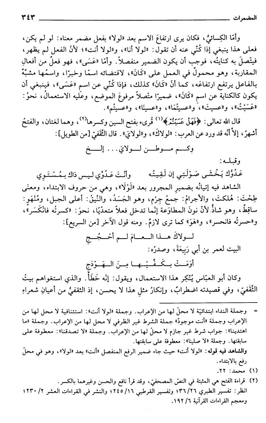 وأمْا الكِسائي، فكان يرى ارتفاعَ الاسم بعد "لولا" بفعل مضمر معناه: لو لم يكن، فعلى هذا ينبغي إذا كُني عنه أن تقول: "لولا أنا"، و"لولا أنت"؛ لأن الفعل لم يظهر، فيتصلَ به كنايتُه، فوجب أن يكون الضمير منفصلًا. وأمّا "عَسَى"، فهو فعل من أفعالِ المقاربة، وهو محمولٌ في العمل على "كَانَ"، لاقتضائه اسمًا وخبرًا، واسمُها مشبَّهٌ بالفاعل يرتفع ارتفاعَه، كما أن "كَانَ" كذلك، فإذا كُنَّي عن اسم "عَسَى"، فينبغي أن يكون كالكناية عن اسمِ "كَانَ"، ضميرا متّصلًا مرفوعَ الموضع، وعَليه الاستعمالُ، نحوُ: "عَسَيتُ"، و"عسيتَ"، و"عسيتُمَا"، و"عسينَا"، و"عسيتُم".