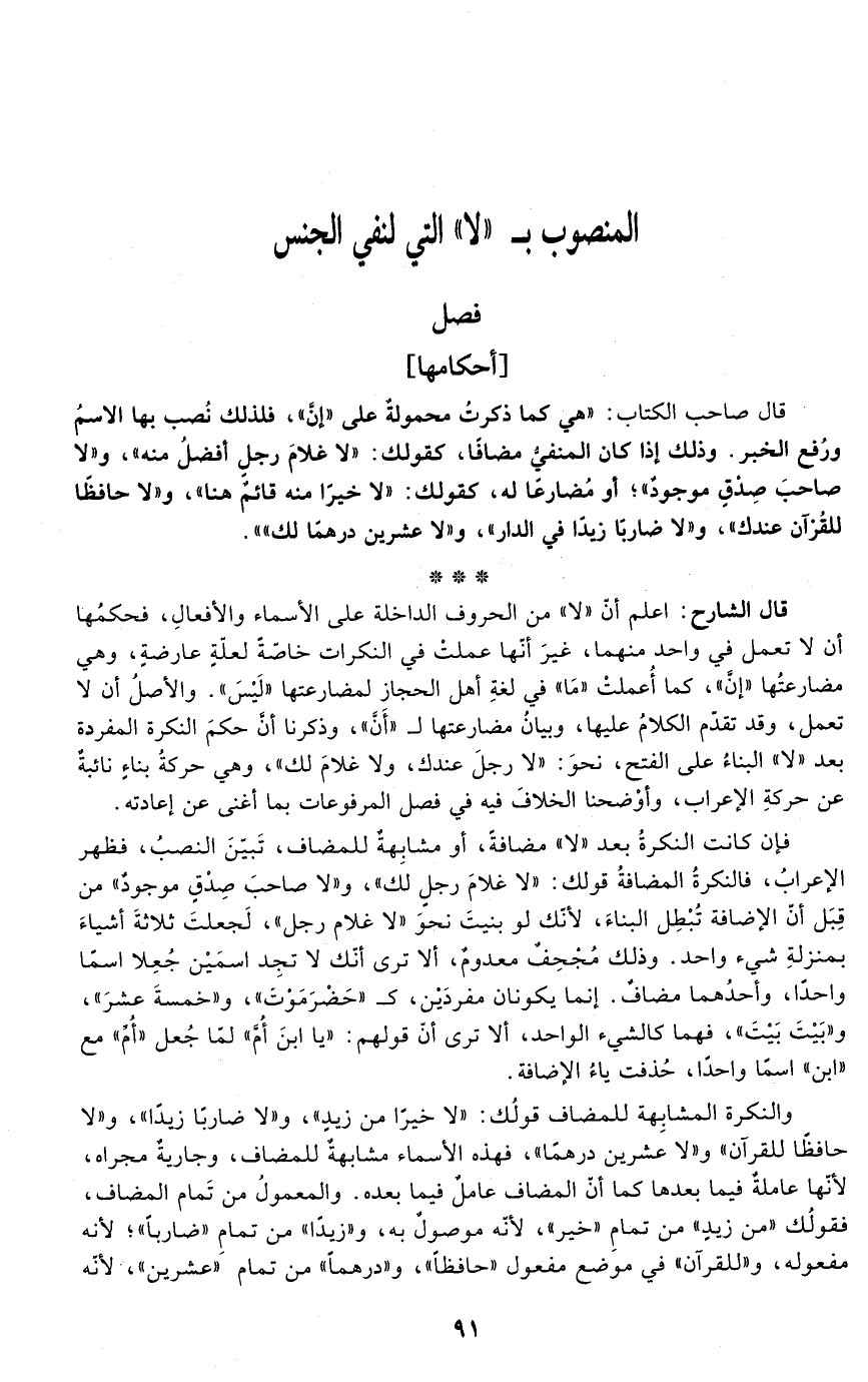 قال الشارح: اعلم أنّ "لا" من الحروف الداخلة على الأسماء والأفعالِ، فحكمُها أنّ لا تعمل في واحد منهما، غيرَ أنّها عملتْ في النكرات خاصّةً لعلّةٍ عارضةٍ، وهي مضارعتُها "إنَّ"، كما أُعملتْ "مَا" في لغةِ أهل الحجاز لمضارعتها "لَيْسَ". والأصلُ أنّ لا تعمل، وقد تقدّم الكلامُ عليها، وبيانُ مضارعتها لـ "أَنَّ"، وذكرنا أنَّ حكمَ النكرة المفردة بعد "لا" البناءُ على الفتح، نحوَ: "لا رجلَ عندك، ولا غلامَ لك"، وهي حركةُ بناءٍ نائبةٌ عن حركةِ الإعراب، وأوْضحنا الخلافَ فيه في فصل المرفوعات بما أغنى عن إعادته.