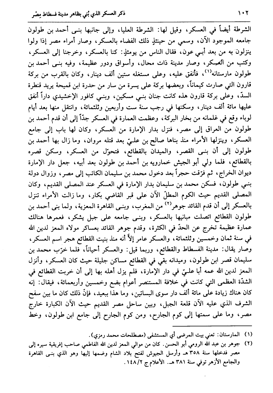 الشرطة أيضا في العسكر، وقيل لها: الشرطة العليا، وإلى جانبها بنى أحمد بن طولون جامعه الموجود الآن، وسمي من حينئذ ذلك الفضاء بالعسكر، وصار أمراء مصر إذا ولوا ينزلون به من بعد أبي عون، فقال الناس من يومئذ: كنا بالعسكر، وخرجنا إلى العسكر، وكتب من العسكر، وصار مدينة ذات محال، وأسواق ودور عظيمة، وفيه بنى أحمد بن طولون مارستانه «1» ، فأنفق عليه، وعلى مستغله ستين ألف دينار، وكان بالقرب من بركة قارون التي صارت كيمانا، وبعضها بركة على يسرة من سار من حدرة ابن قميحة يريد قنطرة السدّ، وعلى بركة قارون هذه كانت جنان بني مسكين، وبني كافور الإخشيدي دارا أنفق عليها مائة ألف دينار، وسكنها في رجب سنة ست وأربعين وثلثمائة، وانتقل منها بعد أيام عليها مائة ألف دينار، وسكنها في رجب سنة ست وأربعين وثلثمائة، وانتقل منها بعد أيام لوباء وقع في غلمانه من بخار البركة، وعظمت العمارة في العسكر جدّا إلى أن قدم أحمد بن طولون من العراق إلى مصر، فنزل بدار الإمارة من العسكر، وكان لها باب إلى جامع العسكر، وينزلها الأمراء منذ بناها صالح بن عليّ بعد قتله مروان، وما زال بها أحمد بن طولون إلى أن بنى القصر، والميدان بالقطائع، فتحوّل من العسكر، وسكن قصره بالقطائع، فلما ولي أبو الجيش خمارويه بن أحمد بن طولون بعد أبيه، جعل دار الإمارة ديوان الخراج، ثم فرّقت حجرا بعد دخول محمد بن سليمان الكاتب إلى مصر، وزوال دولة بني طولون، فسكن محمد بن سليمان بدار الإمارة في العسكر عند المصلى القديم، وكان المصلى القديم حيث الكوم المطلّ الآن على قبر القاضي بكار، وما زالت الأمراء تنزل بالعسكر إلى أن قدم القائد جوهر «2» من المغرب، وبنى القاهرة المعزية، ولما بنى أحمد بن طولون القطائع اتصلت مبانيها بالعسكر، وبنى جامعه على جبل يشكر، فعمرها هنا لك عمارة عظيمة تخرج عن الحدّ في الكثرة، وقدم جوهر القائد بعساكر مولاه المعز لدين الله في سنة ثمان وخمسين وثلثمائة، والعسكر عامر إلّا أنه منذ بنيت القطائع هجر اسم العسكر، وصار يقال: مدينة الفسطاط والقطائع، وربما قيل: والعسكر أحيانا، فلما خرّب محمد بن سليمان قصر ابن طولون، وميدانه بقي في القطائع مساكن جليلة حيث كان العسكر، وأنزل المعز لدين الله عمه أبا عليّ في دار الإمارة، فلم يزل أهله بها إلى أن خربت القطائع في الشدّة العظمى التي كانت في خلافة المستنصر أعوام بضع وخمسين وأربعمائة، فيقال: إنه كان هناك زيادة على مائة ألف دار سوى البساتين، وما هذا ببعيد، فإنّ ذلك كان ما بين سفح الشرف الذي عليه الآن قلعة الجبل، وبين ساحل مصر القديم حيث الآن الكبارة خارج مصر، وما على سمتها إلى كوم الجارح، ومن كوم الجارح إلى جامع ابن طولون، وخط