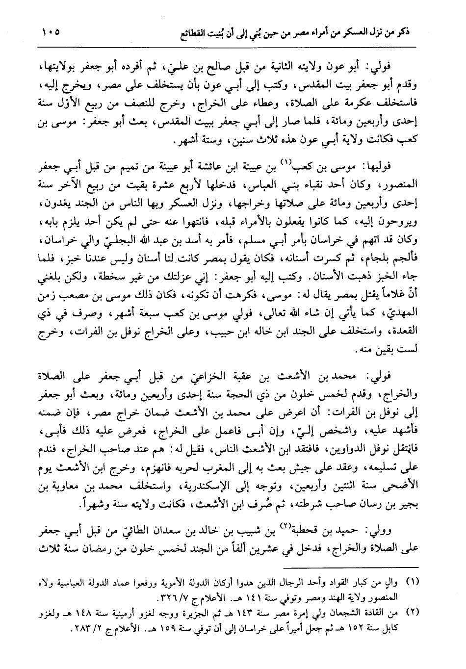 فوليها: موسى بن كعب «1» بن عيينة ابن عائشة أبو عيينة من تميم من قبل أبي جعفر المنصور، وكان أحد نقباء بني العباس، فدخلها لأربع عشرة بقيت من ربيع الآخر سنة إحدى وأربعين ومائة على صلاتها وخراجها، ونزل العسكر وبها الناس من الجند يغدون، ويروحون إليه، كما كانوا يفعلون بالأمراء قبله، فانتهوا عنه حتى لم يكن أحد يلزم بابه، وكان قد اتهم في خراسان بأمر أبي مسلم، فأمر به أسد بن عبد الله البجليّ والي خراسان، فألجم بلجام، ثم كسرت أسنانه، فكان يقول بمصر كانت لنا أسنان وليس عندنا خبز، فلما جاء الخبز ذهبت الأسنان. وكتب إليه أبو جعفر: إني عزلتك من غير سخطة، ولكن بلغني أنّ غلاما يقتل بمصر يقال له: موسى، فكرهت أن تكونه، فكان ذلك موسى بن مصعب زمن المهديّ، كما يأتي إن شاء الله تعالى، فولي موسى بن كعب سبعة أشهر، وصرف في ذي القعدة، واستخلف على الجند ابن خاله ابن حبيب، وعلى الخراج نوفل بن الفرات، وخرج لست بقين منه.