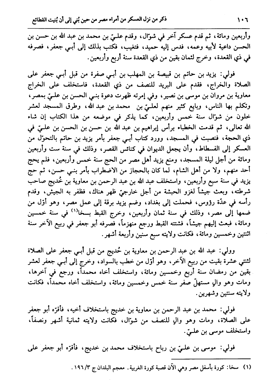 فولي: يزيد بن حاتم بن قبيصة بن المهلب بن أبي صفرة من قبل أبي جعفر على الصلاة والخراج، فقدم على البريد للنصف من ذي القعدة، فاستخلف على الخراج معاوية بن مروان بن موسى بن نصير، وفي إمرته ظهرت دعوة بني الحسن بن عليّ بمصر، وتكلم بها الناس، وبايع كثير منهم لعليّ بن محمد بن عبد الله، وطرق المسجد لعشر خلون من شوّال سنة خمس وأربعين، كما يذكر في موضعه من هذا الكتاب إن شاء الله تعالى، ثم قدمت الخطباء برأس إبراهيم بن عبد الله بن حسن بن الحسن بن عليّ في ذي الحجة، فنصبت في المسجد، وورد كتاب أبي جعفر بأمر يزيد بن حاتم بالتحوّل من العسكر إلى الفسطاط، وأن يجعل الديوان في كنائس القصر، وذلك في سنة ست وأربعين ومائة من أجل ليلة المسجد، ومنع يزيد أهل مصر من الحج سنة خمس وأربعين، فلم يحج أحد منهم، ولا من أهل الشام، لما كان بالحجاز من الاضطراب بأمر بني حسن، ثم حج يزيد في سنة سبع وأربعين، واستخلف عبد الله بن عبد الرحمن بن معاوية بن خديج صاحب شرطته، وبعث جيشا لغزو الحبشة من أجل خارجيّ ظهر هناك، فظفر به الجيش، وقدم رأسه في عدّة رؤوس، فحملت إلى بغداد، وضم يزيد برقة إلى عمل مصر، وهو أوّل من ضمها إلى مصر، وذلك في سنة ثمان وأربعين، وخرج القبط بسخا «1» في سنة خمسين ومائة، فبعث إليهم جيشا، فشتته القبط ورجع منهزما، فصرفه أبو جعفر في ربيع الآخر سنة اثنتين وخمسين ومائة، فكانت ولايته سبع سنين وأربعة أشهر.