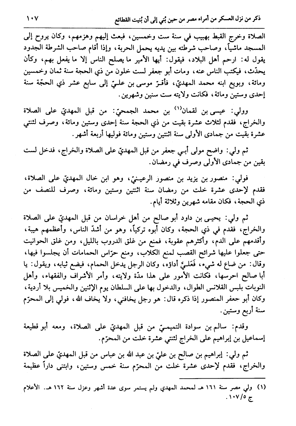 الصلاة وخرج القبط بهبيب في سنة ست وخمسين، فبعث إليهم وهزمهم، وكان يروح إلى المسجد ماشيا، وصاحب شرطته بين يديه يحمل الحربة، وإذا أقام صاحب الشرطة الجدود يقول له: ارحم أهل البلاد، فيقول: أيها الأمير ما يصلح الناس إلا ما يفعل بهم، وكأن يحدّث، فيكتب الناس عنه، ومات أبو جعفر لست خلون من ذي الحجة سنة ثمان وخمسين ومائة، وبويع ابنه محمد المهديّ، فأقرّ موسى بن عليّ إلى سابع عشر ذي الحجّة سنة إحدى وستين ومائة، فكانت ولايته ست سنين وشهرين.