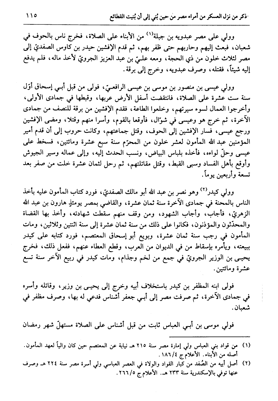 وولي كيدر «2» وهو نصر بن عبد الله أبو مالك الصفديّ، فورد كتاب المأمون عليه بأخذ الناس بالمحنة في جمادى الآخرة سنة ثمان عشرة، والقاضي بمصر يومئذ هارون بن عبد الله الزهريّ، فأجاب، وأجاب الشهود، ومن وقف منهم سقطت شهادته، وأخذ بها القضاة والمحدّثون والمؤذنون، فكانوا على ذلك من سنة ثمان عشرة إلى سنة اثنتين وثلاثين، ومات المأمون في رجب سنة ثمان عشرة، وبويع أبو إسحاق المعتصم، فورد كتابه على كيدر ببيعته، ويأمره بإسقاط من في الديوان من العرب، وقطع العطاء عنهم، ففعل ذلك، فخرج يحيى بن الوزير الجرويّ في جمع من لخم وجذام، ومات كيدر في ربيع الآخر سنة تسع عشرة ومائتين.