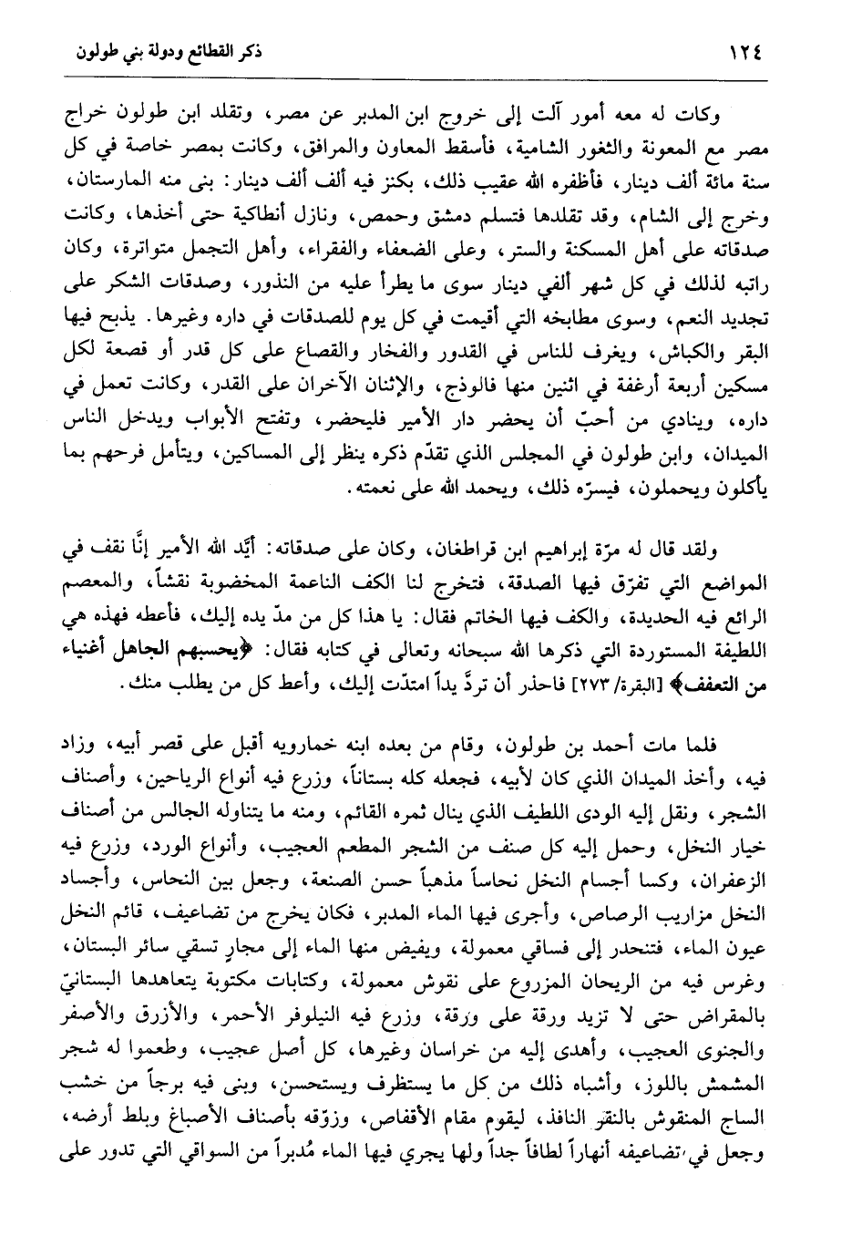 وكات له معه أمور آلت إلى خروج ابن المدبر عن مصر، وتقلد ابن طولون خراج مصر مع المعونة والثغور الشامية، فأسقط المعاون والمرافق، وكانت بمصر خاصة في كل سنة مائة ألف دينار، فأظفره الله عقيب ذلك، بكنز فيه ألف ألف دينار: بنى منه المارستان، وخرج إلى الشام، وقد تقلدها فتسلم دمشق وحمص، ونازل أنطاكية حتى أخذها، وكانت صدقاته على أهل المسكنة والستر، وعلى الضعفاء والفقراء، وأهل التجمل متواترة، وكان راتبه لذلك في كل شهر ألفي دينار سوى ما يطرأ عليه من النذور، وصدقات الشكر على تجديد النعم، وسوى مطابخه التي أقيمت في كل يوم للصدقات في داره وغيرها. يذبح فيها البقر والكباش، ويغرف للناس في القدور والفخار والقصاع على كل قدر أو قصعة لكل مسكين أربعة أرغفة في اثنين منها فالوذج، والاثنان الآخران على القدر، وكانت تعمل في داره، وينادي من أحبّ أن يحضر دار الأمير فليحضر، وتفتح الأبواب ويدخل الناس الميدان، وابن طولون في المجلس الذي تقدّم ذكره ينظر إلى المساكين، ويتأمل فرحهم بما يأكلون ويحملون، فيسرّه ذلك، ويحمد الله على نعمته.