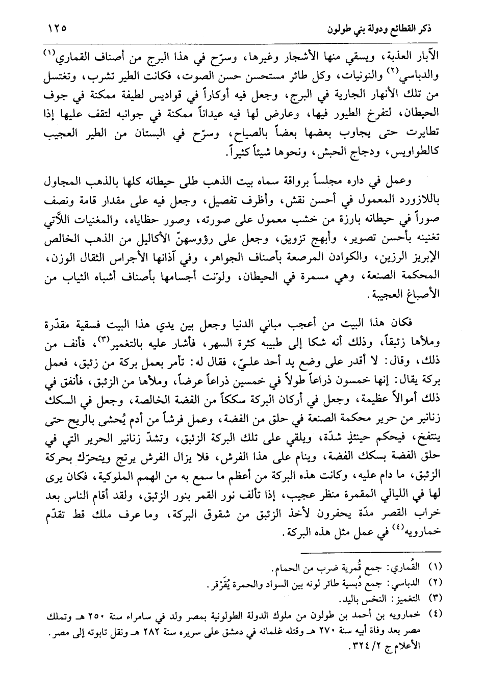 فكان هذا البيت من أعجب مباني الدنيا وجعل بين يدي هذا البيت فسقية مقدّرة وملأها زئبقا، وذلك أنه شكا إلى طبيبه كثرة السهر، فأشار عليه بالتغمير «3» ، فأنف من ذلك، وقال: لا أقدر على وضع يد أحد عليّ، فقال له: تأمر بعمل بركة من زئبق، فعمل بركة يقال: إنها خمسون ذراعا طولا في خمسين ذراعا عرضا، وملأها من الزئبق، فأنفق في ذلك أموالا عظيمة، وجعل في أركان البركة سككا من الفضة الخالصة، وجعل في السكك زنانير من حرير محكمة الصنعة في حلق من الفضة، وعمل فرشا من أدم يحشى بالريح حتى ينتفخ، فيحكم حينئذ شدّة، ويلقي على تلك البركة الزئبق، وتشدّ زنانير الحرير التي في حلق الفضة بسكك الفضة، وينام على هذا الفرش، فلا يزال الفرش يرتج ويتحرّك بحركة الزئبق، ما دام عليه، وكانت هذه البركة من أعظم ما سمع به من الهمم الملوكية، فكان يرى لها في الليالي المقمرة منظر عجيب، إذا تألف نور القمر بنور الزئبق، ولقد أقام الناس بعد خراب القصر مدّة يحفرون لأخذ الزئبق من شقوق البركة، وما عرف ملك قط تقدّم خمارويه «4» في عمل مثل هذه البركة.