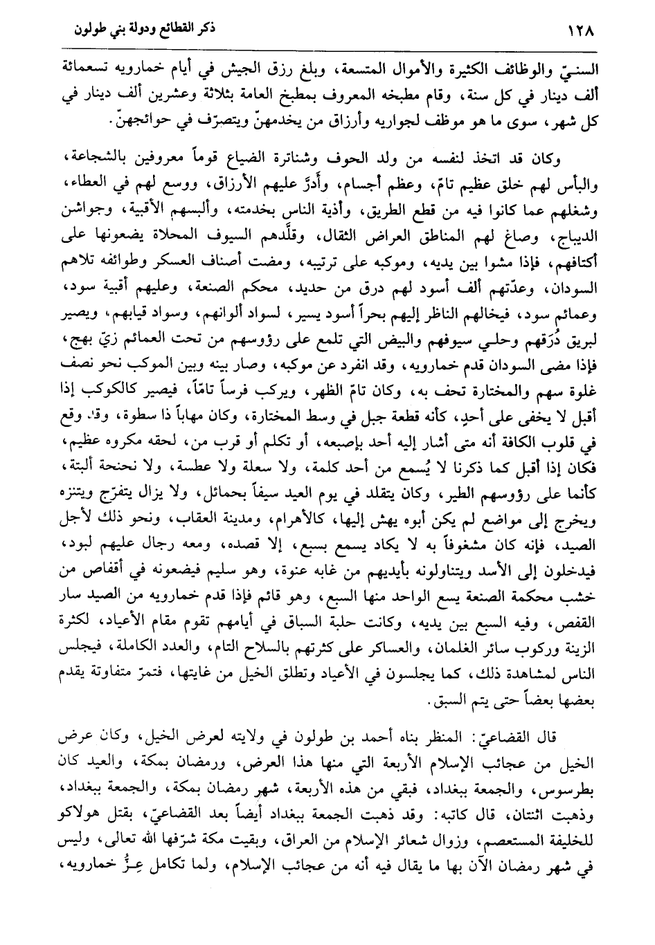 وكان قد اتخذ لنفسه من ولد الحوف وشناترة الضياع قوما معروفين بالشجاعة، والبأس لهم خلق عظيم تامّ، وعظم أجسام، وأدرّ عليهم الأرزاق، ووسع لهم في العطاء، وشغلهم عما كانوا فيه من قطع الطريق، وأذية الناس بخدمته، وألبسهم الأقبية، وجواشن الديباج، وصاغ لهم المناطق العراض الثقال، وقلّدهم السيوف المحلاة يضعونها على أكتافهم، فإذا مشوا بين يديه، وموكبه على ترتيبه، ومضت أصناف العسكر وطوائفه تلاهم السودان، وعدّتهم ألف أسود لهم درق من حديد، محكم الصنعة، وعليهم أقبية سود، وعمائم سود، فيخالهم الناظر إليهم بحرا أسود يسير، لسواد ألوانهم، وسواد قيابهم، ويصير لبريق درقهم وحلي سيوفهم والبيض التي تلمع على رؤوسهم من تحت العمائم زيّ بهج، فإذا مضى السودان قدم خمارويه، وقد انفرد عن موكبه، وصار بينه وبين الموكب نحو نصف غلوة سهم والمختارة تحف به، وكان تامّ الظهر، ويركب فرسا تامّا، فيصير كالكوكب إذا أقبل لا يخفى على أحد، كأنه قطعة جبل في وسط المختارة، وكان مهابا ذا سطوة، وقد وقع في قلوب الكافة أنه متى أشار إليه أحد بإصبعه، أو تكلم أو قرب من، لحقه مكروه عظيم، فكان إذا أقبل كما ذكرنا لا يسمع من أحد كلمة، ولا سعلة ولا عطسة، ولا نحنحة البتة، كأنما على رؤوسهم الطير، وكان يتقلد في يوم العيد سيفا بحمائل، ولا يزال يتفرّج ويتنزه ويخرج إلى مواضع لم يكن أبوه يهش إليها، كالأهرام، ومدينة العقاب، ونحو ذلك لأجل الصيد، فإنه كان مشغوفا به لا يكاد يسمع بسبع، إلا قصده، ومعه رجال عليهم لبود، فيدخلون إلى الأسد ويتناولونه بأيديهم من غابه عنوة، وهو سليم فيضعونه في أقفاص من خشب محكمة الصنعة يسع الواحد منها السبع، وهو قائم فإذا قدم خمارويه من الصيد سار القفص، وفيه السبع بين يديه، وكانت حلبة السباق في أيامهم تقوم مقام الأعياد، لكثرة الزينة وركوب سائر الغلمان، والعساكر على كثرتهم بالسلاح التام، والعدد الكاملة، فيجلس الناس لمشاهدة ذلك، كما يجلسون في الأعياد وتطلق الخيل من غايتها، فتمرّ متفاوتة يقدم بعضها بعضا حتى يتم السبق.