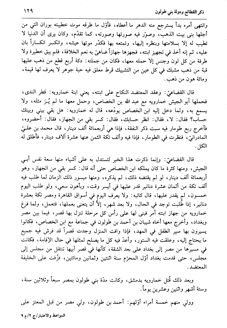 قال القضاعيّ: وإنما ذكرت هذا الخبر لتستدل به على أشياء منها سعة نفس أبي الجيش، ومنها كثرة ما كان يملكه ابن الخصاص حتى أنه قال: كسر بقي من الجهاز، وهو أربعمائة ألف دينار، لو لم يقتضه ذلك، لم يذكره، ومنها ميسور ذلك الزمان لما طلب فيه ألف تكة من أثمان عشرة دنانير قدر عليها في أيسر وقت، وبأهون سعي، ولو طلب اليوم خمسون، لم يقدر عليها، قال كاتبه: ولا يعرف اليوم في أسواق القاهرة ومصر تكة بعشرة دنانير، إذا طلبت توجد في الحال، ولا بعد شهر، إلّا أن يتعنى بعملها، فتعمل، ولما فرغ خمارويه من جهاز ابنته أمر فبنى لها على رأس كل مرحلة تنزل بها قصر، فيما بين مصر وبغداد، وأخرج معها أخاه شيبان بن أحمد بن طولون في جماعة مع ابن الخصاص، فكانوا يسيرون بها سير الطفل في المهد، فإذا وافت المنزل وجدت قصرا قد فرش فيه جميع ما يحتاج إليه، وعلقت فيه الستور، وأعدّ فيه كل ما يصلح لمثلها في حال الإقامة، فكانت في مسيرها من مصر إلى بغداد على بعد الشقة، كأنها في قصر أبيها تنتقل من مجلس إلى مجلس، حتى قدمت بغداد أوّل المحرّم سنة اثنتين وثمانين ومائتين، فزفت على الخليفة المعتضد.