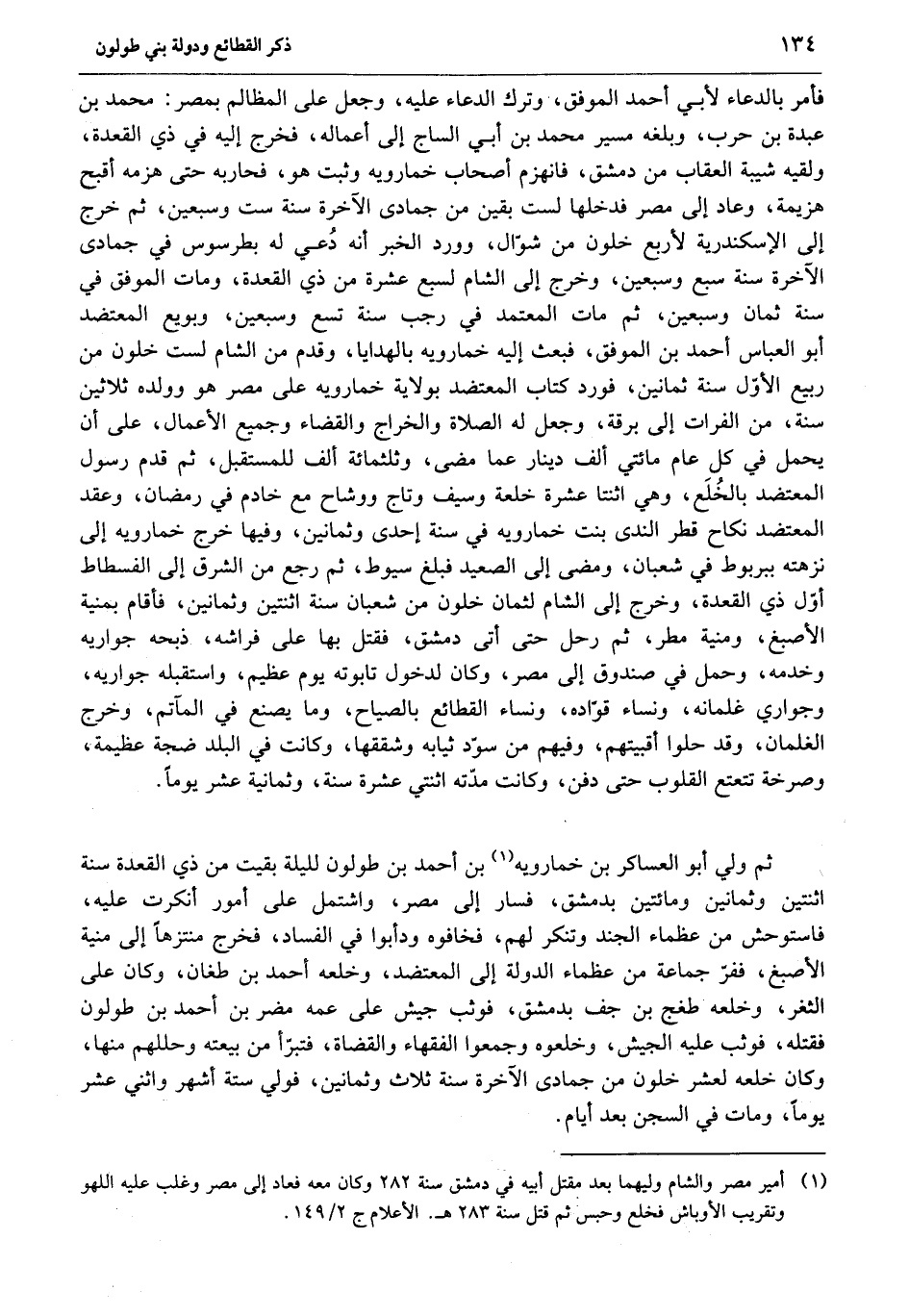 فأمر بالدعاء لأبي أحمد الموفق، وترك الدعاء عليه، وجعل على المظالم بمصر: محمد بن عبدة بن حرب، وبلغه مسير محمد بن أبي الساج إلى أعماله، فخرج إليه في ذي القعدة، ولقيه شيبة العقاب من دمشق، فانهزم أصحاب خمارويه وثبت هو، فحاربه حتى هزمه أقبح هزيمة، وعاد إلى مصر فدخلها لست بقين من جمادى الآخرة سنة ست وسبعين، ثم خرج إلى الإسكندرية لأربع خلون من شوّال، وورد الخبر أنه دعي له بطرسوس في جمادى الآخرة سنة سبع وسبعين، وخرج إلى الشام لسبع عشرة من ذي القعدة، ومات الموفق في سنة ثمان وسبعين، ثم مات المعتمد في رجب سنة تسع وسبعين، وبويع المعتضد أبو العباس أحمد بن الموفق، فبعث إليه خمارويه بالهدايا، وقدم من الشام لست خلون من ربيع الأوّل سنة ثمانين، فورد كتاب المعتضد بولاية خمارويه على مصر هو وولده ثلاثين سنة، من الفرات إلى برقة، وجعل له الصلاة والخراج والقضاء وجميع الأعمال، على أن يحمل في كل عام مائتي ألف دينار عما مضى، وثلثمائة ألف للمستقبل، ثم قدم رسول المعتضد بالخلع، وهي اثنتا عشرة خلعة وسيف وتاج ووشاح مع خادم في رمضان، وعقد المعتضد نكاح قطر الندى بنت خمارويه في سنة إحدى وثمانين، وفيها خرج خمارويه إلى نزهته ببربوط في شعبان، ومضى إلى الصعيد فبلغ سيوط، ثم رجع من الشرق إلى الفسطاط أوّل ذي القعدة، وخرج إلى الشام لثمان خلون من شعبان سنة اثنتين وثمانين، فأقام بمنية الأصبغ، ومنية مطر، ثم رحل حتى أتى دمشق، فقتل بها على فراشه، ذبحه جواريه وخدمه، وحمل في صندوق إلى مصر، وكان لدخول تابوته يوم عظيم، واستقبله جواريه، وجواري غلمانه، ونساء قوّاده، ونساء القطائع بالصياح، وما يصنع في المآتم، وخرج الغلمان، وقد حلوا أقبيتهم، وفيهم من سوّد ثيابه وشققها، وكانت في البلد ضجة عظيمة، وصرخة تتعتع القلوب حتى دفن، وكانت مدّته اثنتي عشرة سنة، وثمانية عشر يوما.