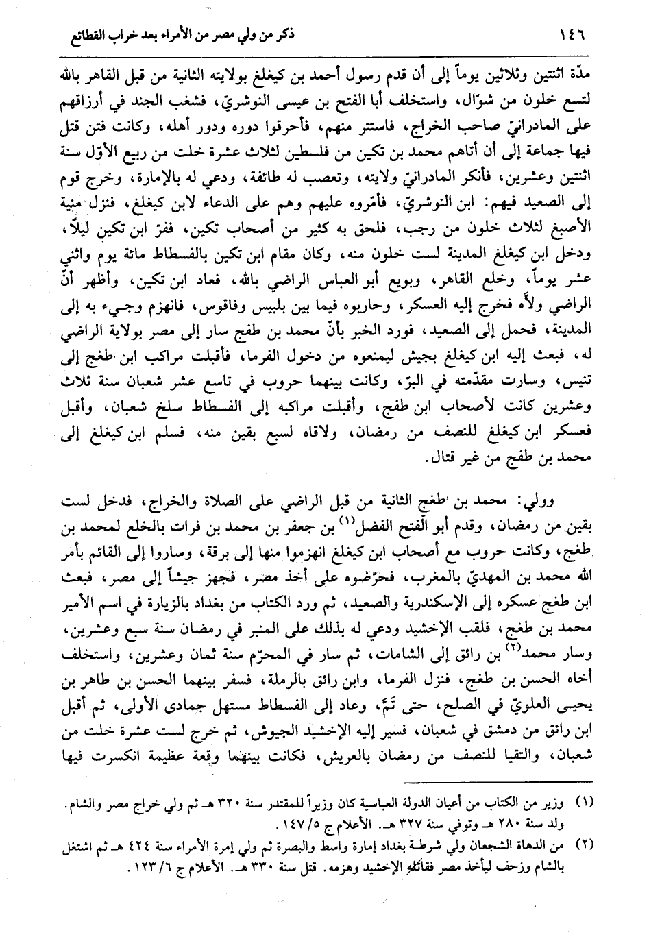مدّة اثنتين وثلاثين يوما إلى أن قدم رسول أحمد بن كيغلغ بولايته الثانية من قبل القاهر بالله لتسع خلون من شوّال، واستخلف أبا الفتح بن عيسى النوشريّ، فشغب الجند في أرزاقهم على المادرانيّ صاحب الخراج، فاستتر منهم، فأحرقوا دوره ودور أهله، وكانت فتن قتل فيها جماعة إلى أن أتاهم محمد بن تكين من فلسطين لثلاث عشرة خلت من ربيع الأوّل سنة اثنتين وعشرين، فأنكر المادرانيّ ولايته، وتعصب له طائفة، ودعي له بالإمارة، وخرج قوم إلى الصعيد فيهم: ابن النوشريّ، فأمّروه عليهم وهم على الدعاء لابن كيغلغ، فنزل منية الأصبغ لثلاث خلون من رجب، فلحق به كثير من أصحاب تكين، ففرّ ابن تكين ليلا، ودخل ابن كيغلغ المدينة لست خلون منه، وكان مقام ابن تكين بالفسطاط مائة يوم واثني عشر يوما، وخلع القاهر، وبويع أبو العباس الراضي بالله، فعاد ابن تكين، وأظهر أنّ الراضي ولّاه فخرج إليه العسكر، وحاربوه فيما بين بلبيس وفاقوس، فانهزم وجيء به إلى المدينة، فحمل إلى الصعيد، فورد الخبر بأنّ محمد بن طفج سار إلى مصر بولاية الراضي له، فبعث إليه ابن كيغلغ بجيش ليمنعوه من دخول الفرما، فأقبلت مراكب ابن طغج إلى تنيس، وسارت مقدّمته في البرّ، وكانت بينهما حروب في تاسع عشر شعبان سنة ثلاث وعشرين كانت لأصحاب ابن طفج، وأقبلت مراكبه إلى الفسطاط سلخ شعبان، وأقبل فعسكر ابن كيغلغ للنصف من رمضان، ولاقاه لسبع بقين منه، فسلم ابن كيغلغ إلى محمد بن طفج من غير قتال.